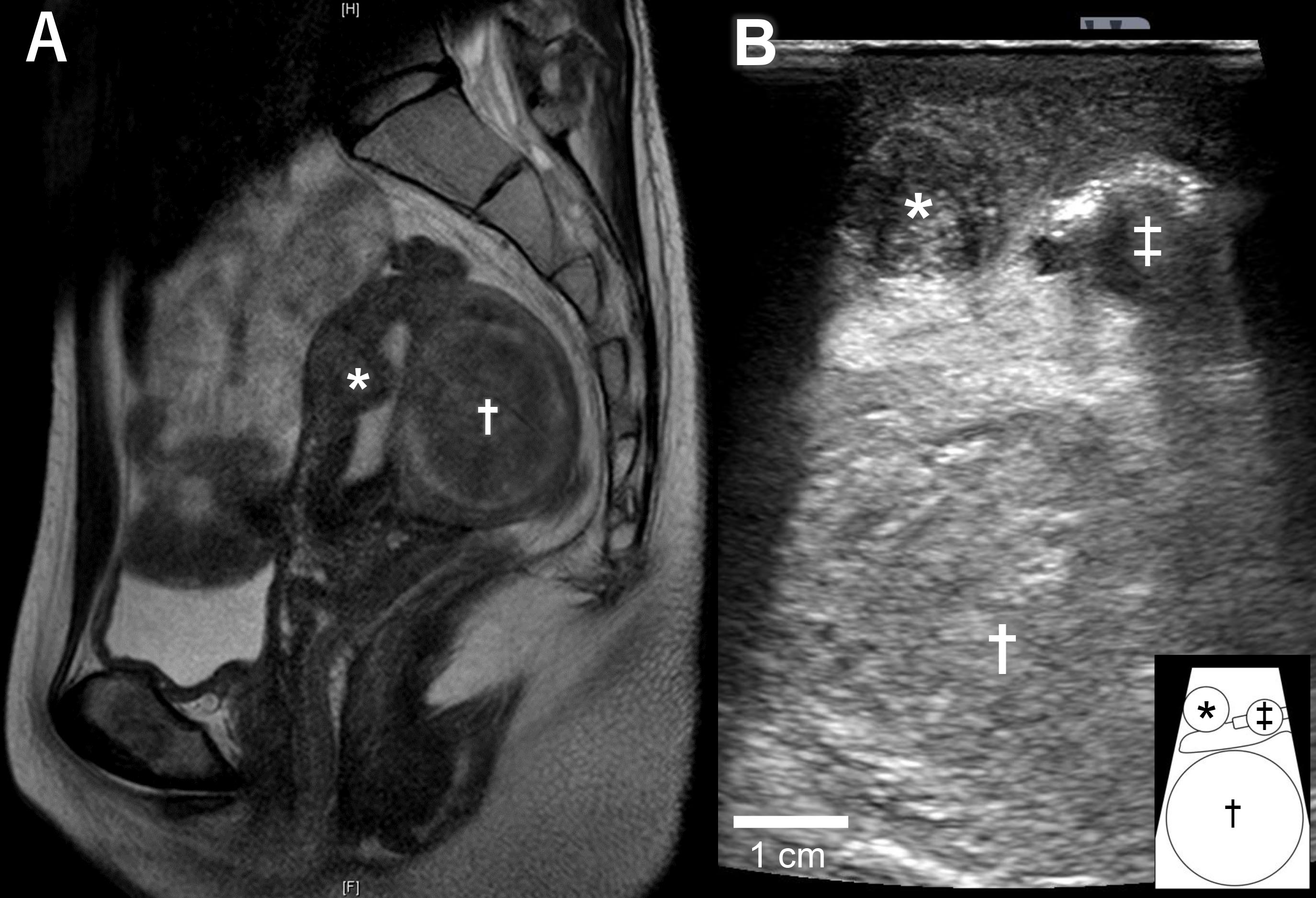 Fig. 1.Images of submucosal and intramural myomas. (A) Magnetic resonance image of the uterus. The submucosal myoma (*) in the anterior wall of the uterus was 40% intramural. The intramural myoma (†) in the posterior wall of the uterus was suggested as a cellular leiomyoma. (B) Image of laparoscopic ultrasonography during laparoscopic surgery. Transducer put on the anterior wall of the uterus, as shown in Fig. 2A, with a submucosal myoma (*) and an intramural myoma (†) clearly shown. A uterine manipulator is indicated by ‡. The schematic diagram at the bottom right explains the image of ultrasonography.
