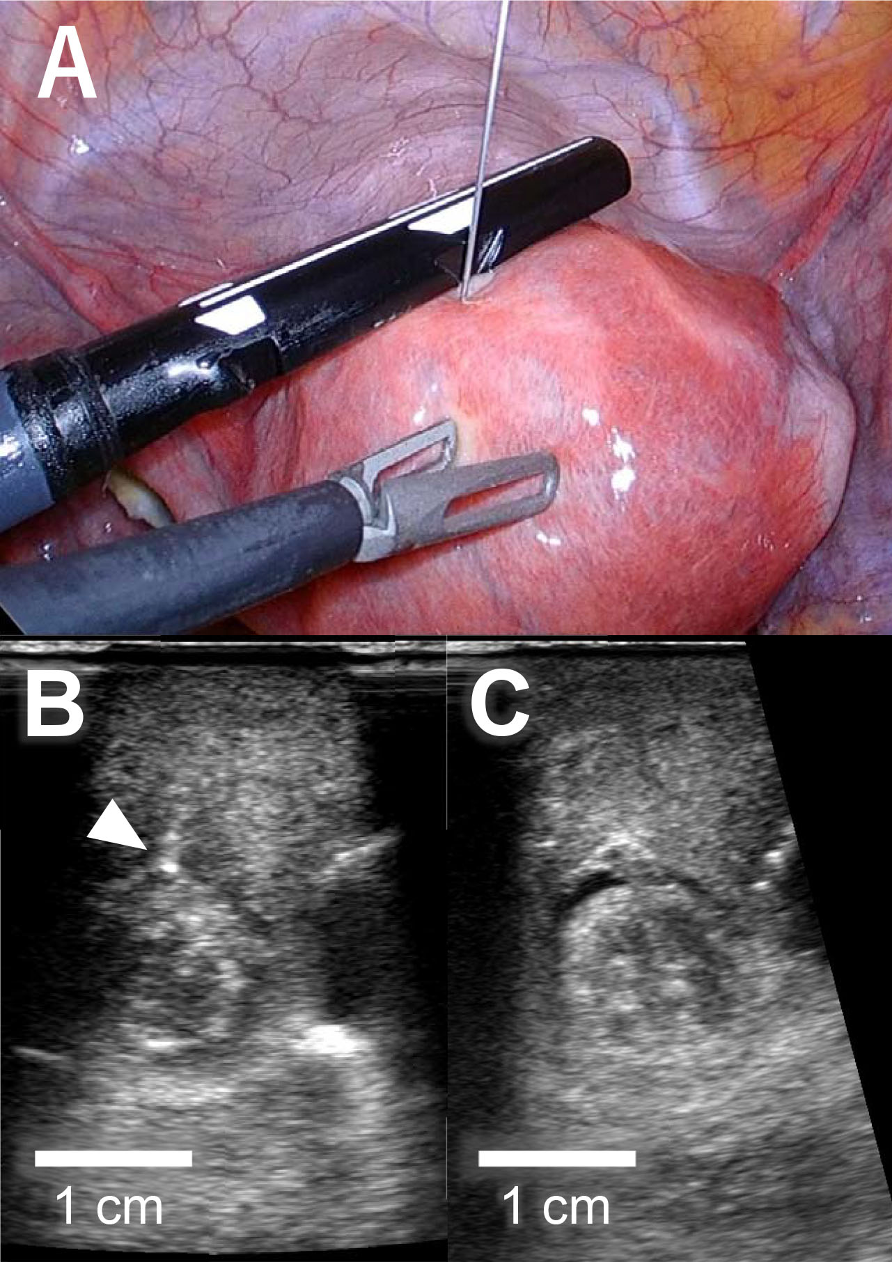 Fig. 2.Injection of vasopressin during laparoscopic myomectomy. (A) Intraperitoneal image during laparoscopic surgery. Diluted vasopressin was injected under ultrasonography guidance. (B) Injection needle (white arrowhead) was inserted to the boundary between the myoma and the myometrium. (C) Injected vasopressin spread in the layer between the myoma and the myometrium.