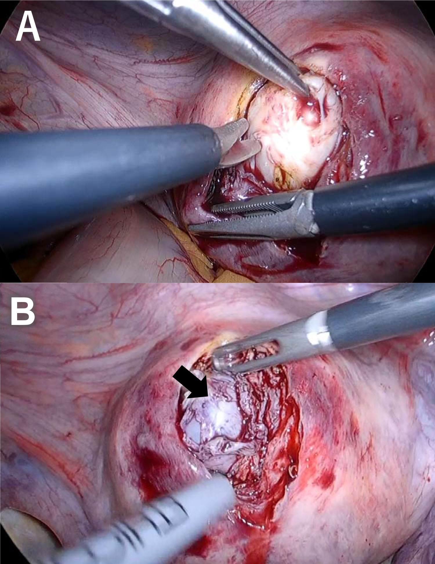 Fig. 3.Laparoscopic images during myomectomy. (A) Myomas are removed using laparoscopic forceps and monopolar cautery. (B) Endometrial integrity was preserved after removal of the submucosal myomas. Black arrow shows the preserved endometrium.