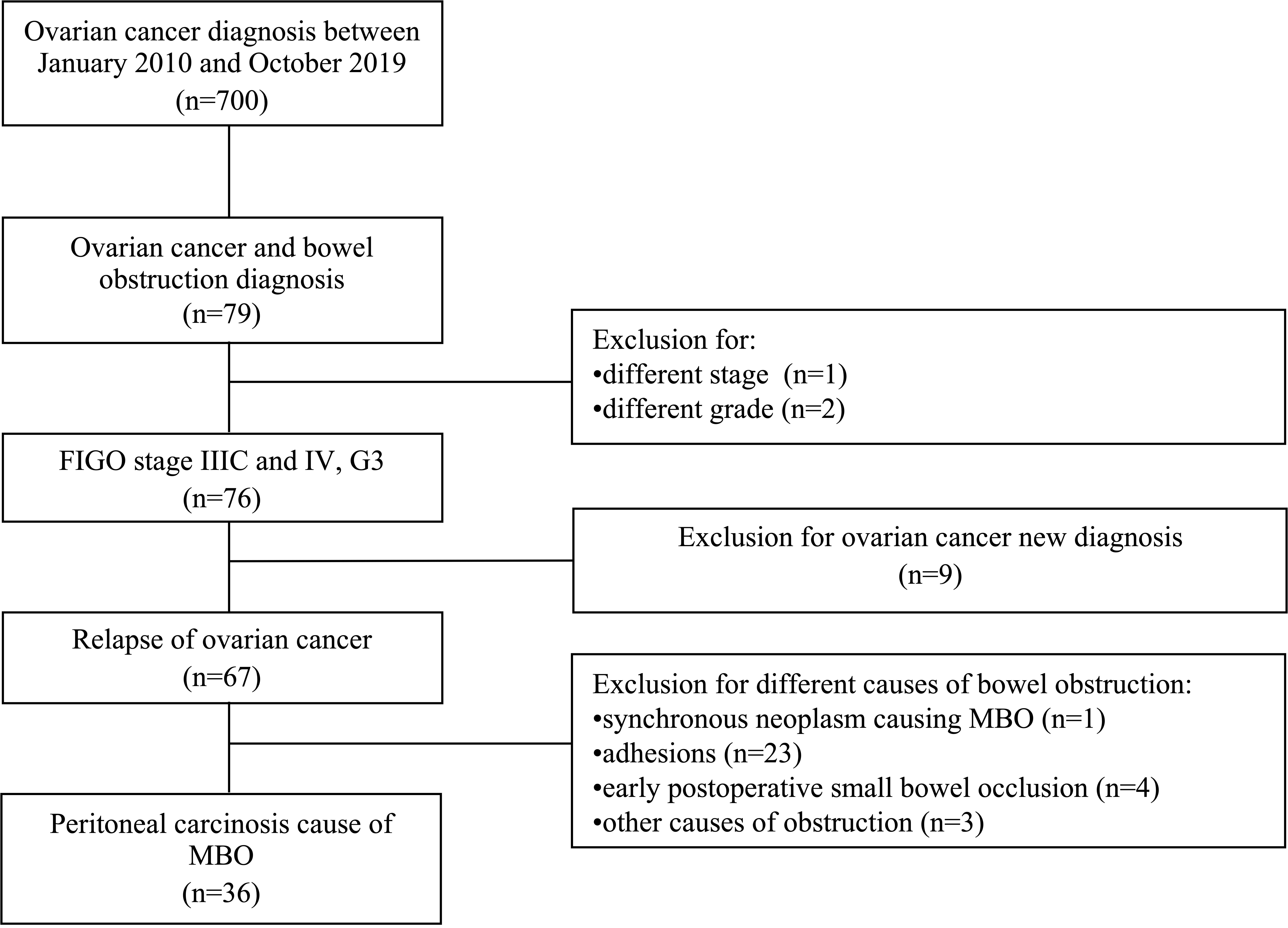 Fig. 1.Shows the recruitment flow chart of the study with the number of patients evaluated and the patients excluded from our study population group. Legend: n, number; FIGO, International Federation of Gynecology and Obstetrics; G, grade; MBO, Malignant Bowel Obstruction.
