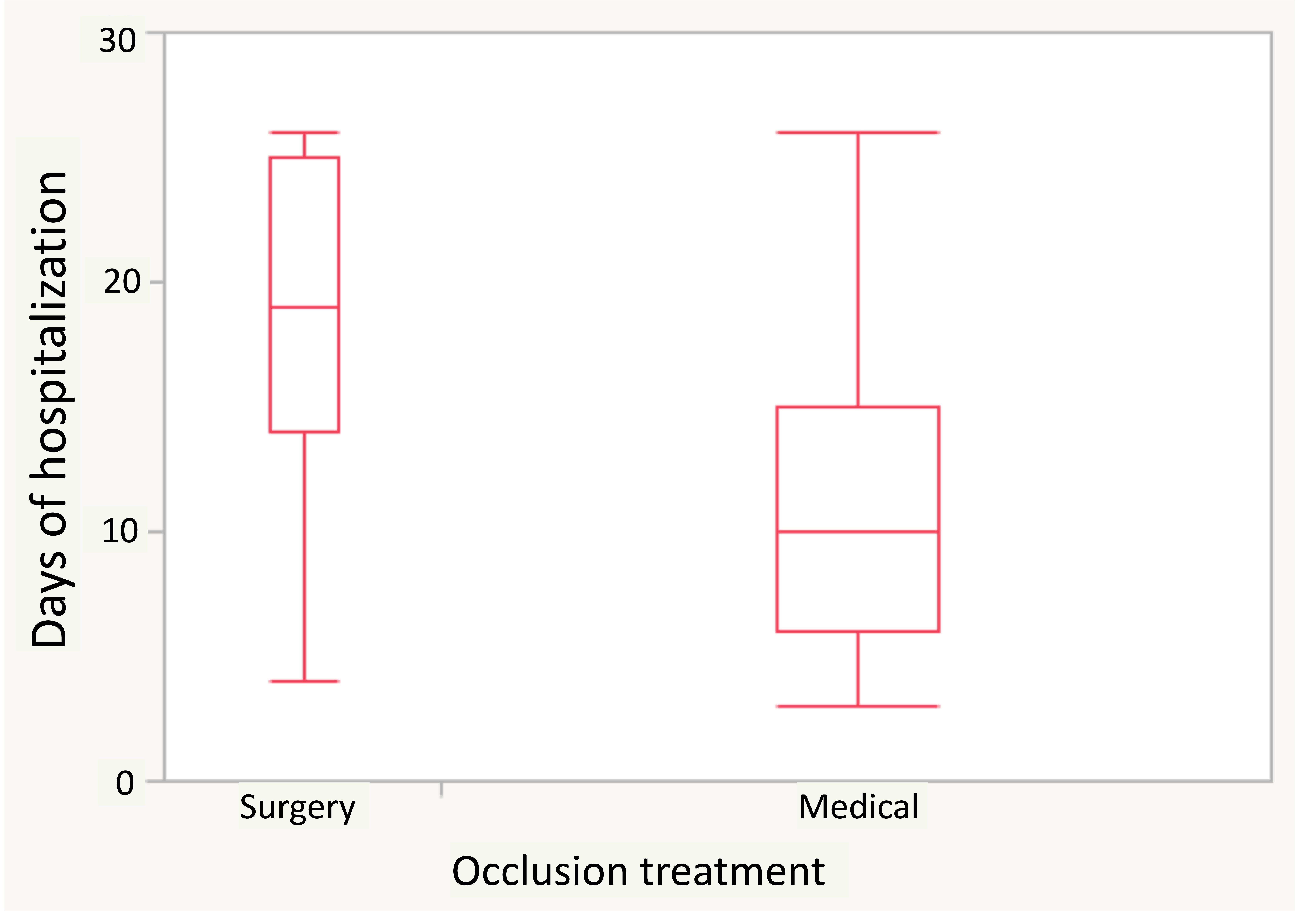 Fig. 2.Distribution of hospitalization days according to occlusion treatment.