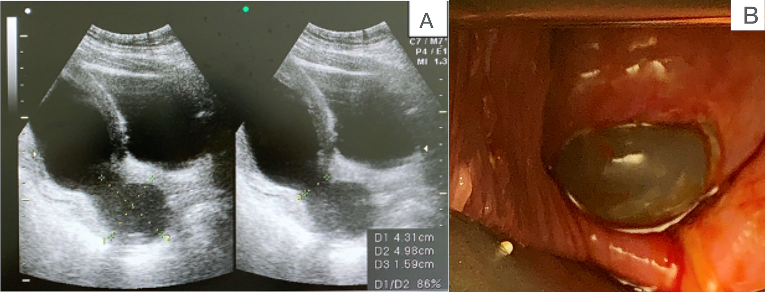 Fig. 1.Diagnosis of cervical insufficiency. (A) Transabdominal sonography finding of a prolapsed amniotic sac. (B) Speculum examination of cervical insufficiency.