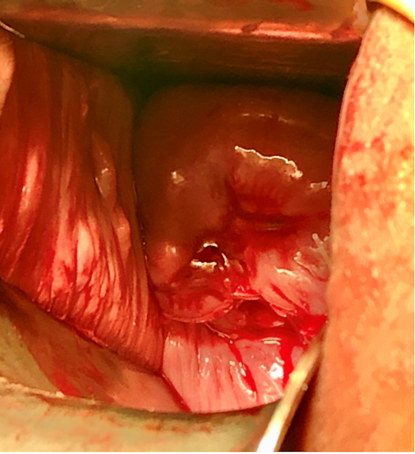 Fig. 2.Speculum examination after reducing the amniotic sac and cerclage insertion for the same patient in Fig. 1.