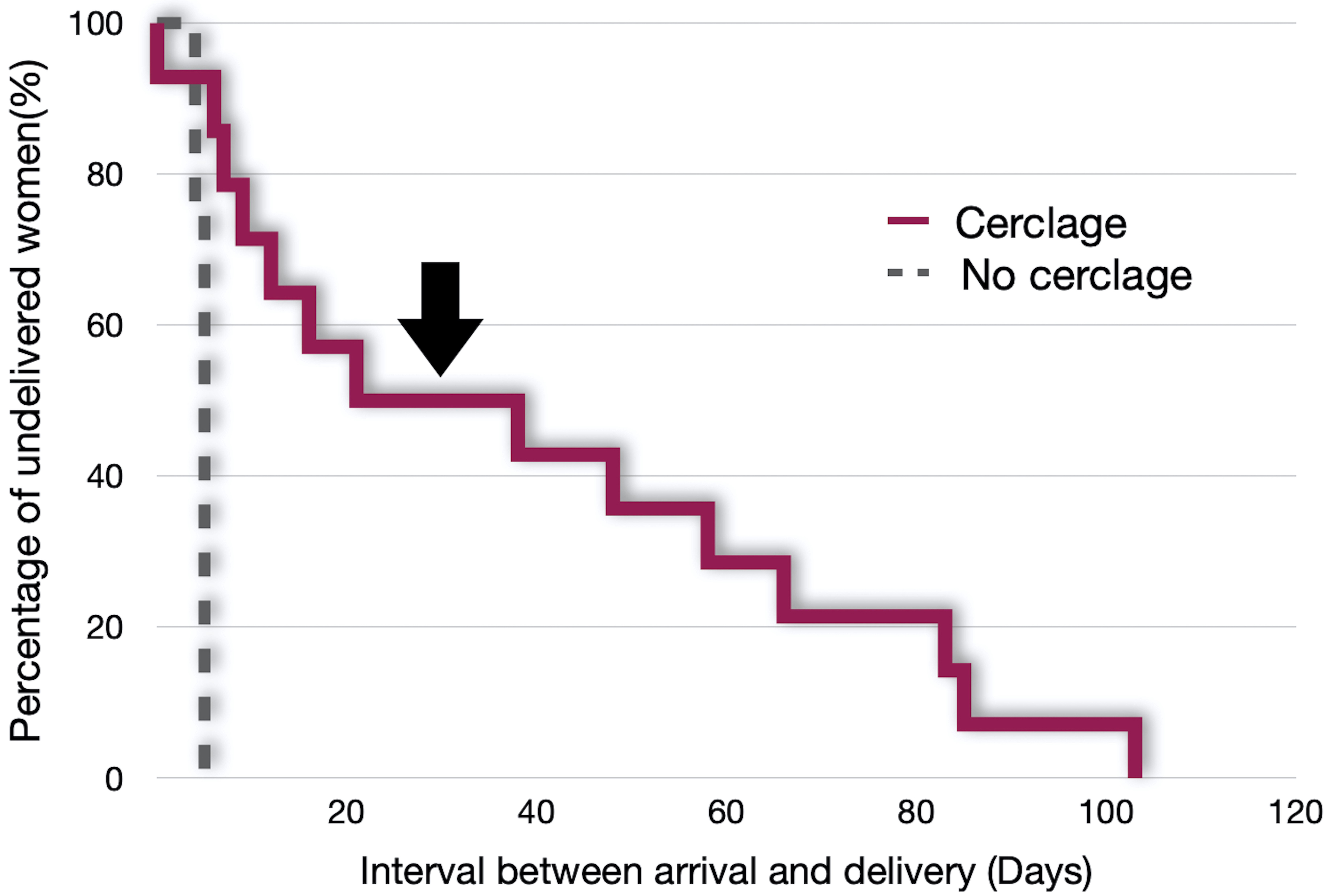 Fig. 3.Comparison of tocolysis duration and cumulative number of undelivered women between no-cerclage and cerclage groups. A plateau at 21 days after surgery significantly differentiated those with early delivery and those with a prolonged pregnancy.