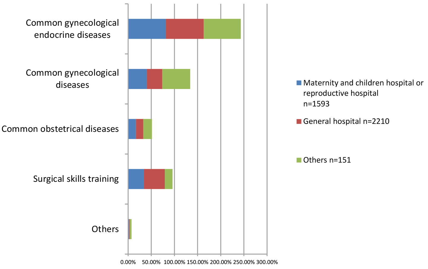 In summary, from our investigation results, in China, doctors in general hospitals have a higher mastery of common gynecological and obstetric diseases than doctors in specialized hospitals, doctors in different types of hospitals generally have a lower mastery of gynecological endocrine-related diseases. So the most preferred training direction and training content Ob & Gy in different types of hospitals were gynecological endocrine-related diseases. Using the Internet is the most popular educational model, however, further study needed to be conducted as to whether the effect of Internet education is better than that of the traditional educational model.