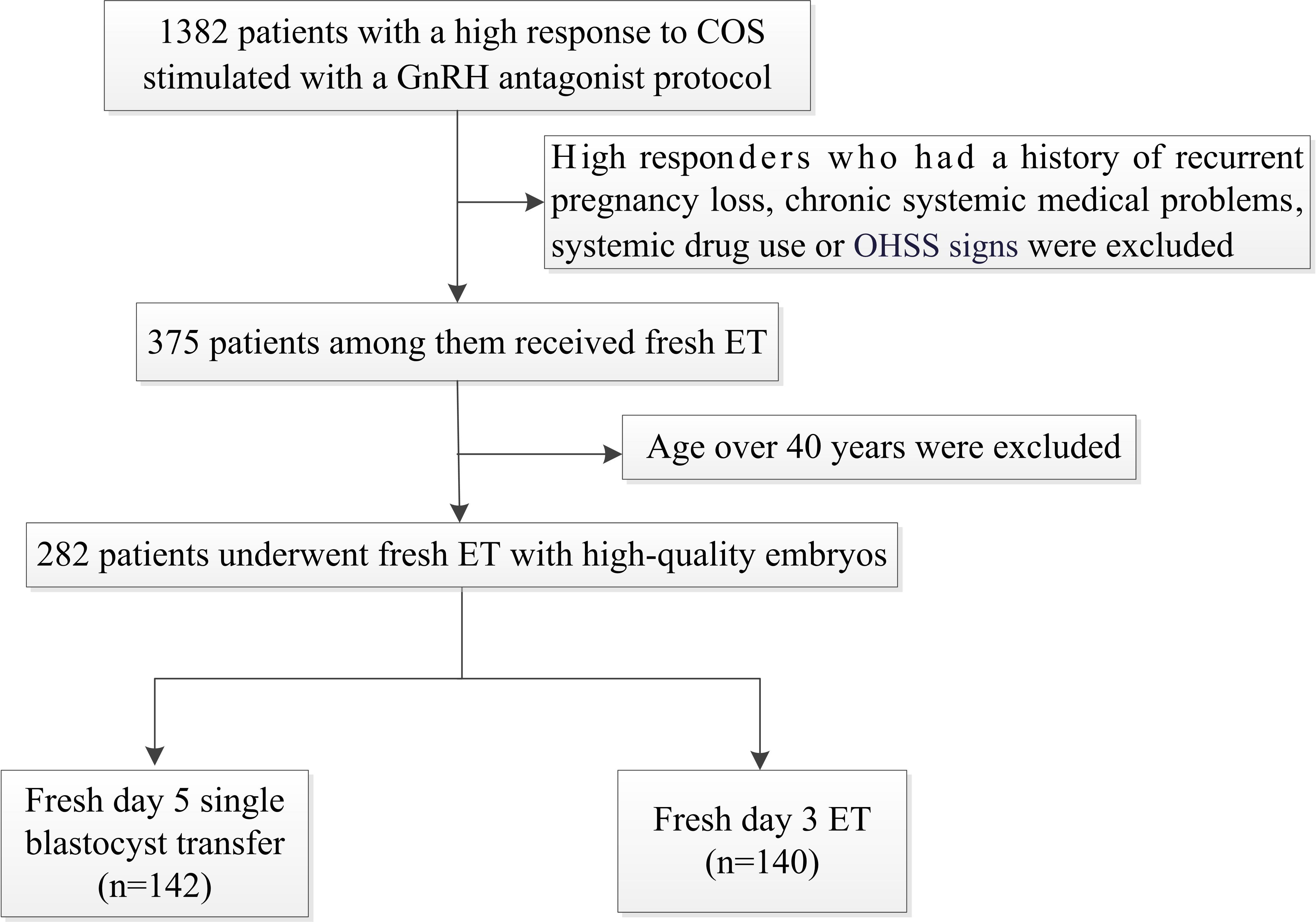Fig. 1.Study flowchart. COS, controlled ovarian stimulation; OHSS, ovarian hyperstimulation syndrome; GnRH, gonadotropin-releasing hormone; ET, embryo transfer.