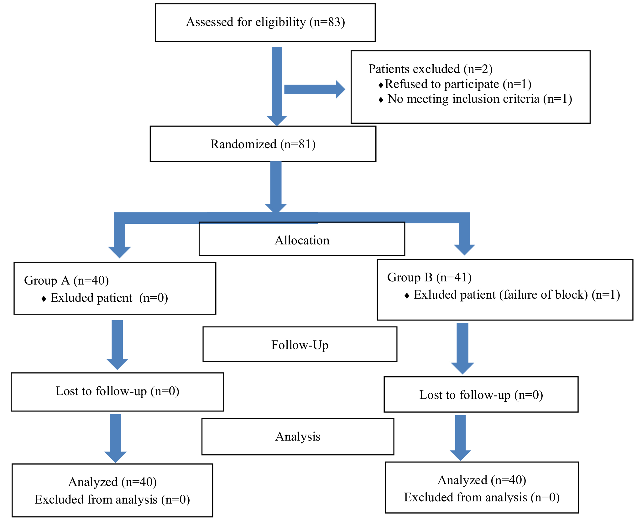 The flow chart of the study participants is shown in Fig. 1. A total of 83 patients were assessed for their eligibility to take part in the trial. Two participants were eliminated from the study due to their refusal to participate and failure to meet the inclusion criteria. As a consequence, a total of 81 individuals were recruited for the study. One patient in Group B was excluded from the analysis after randomization due to failed block. The final analysis contained a total of 80 patients.