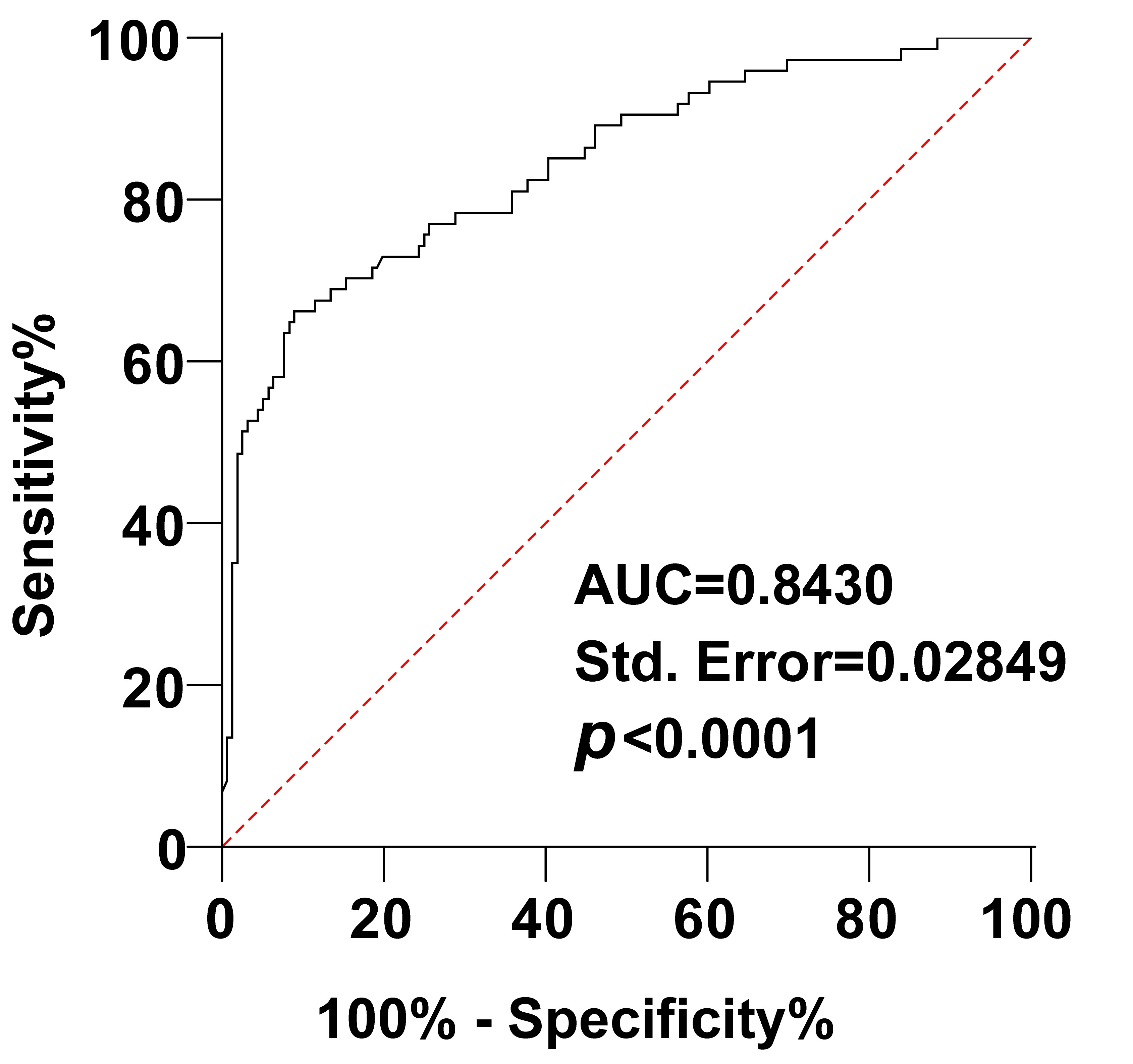 we conducted ROC curves analyses, which yielded an AUC of 0.8430, with 66.22%