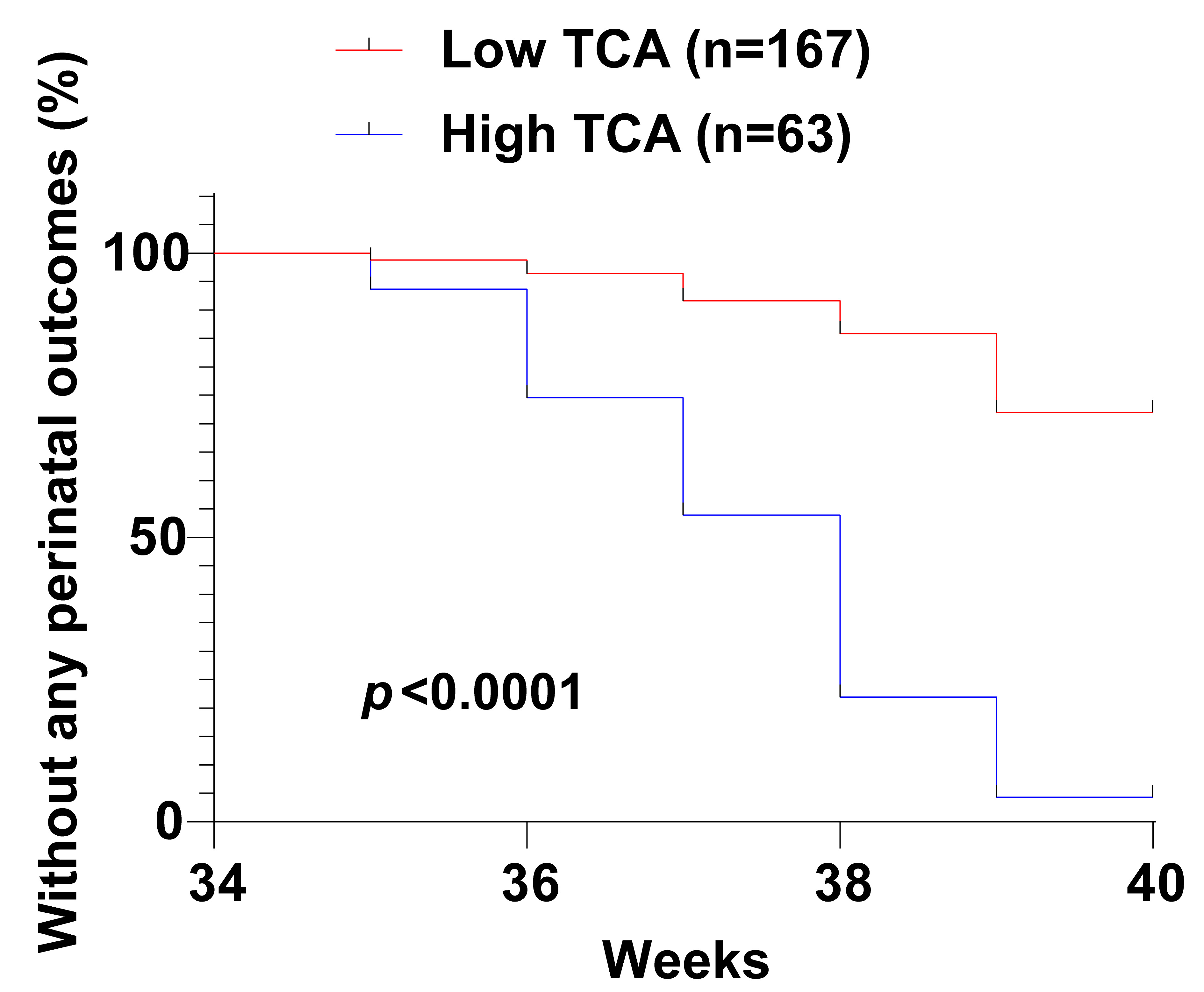 Fig. 4.Kaplan-Meier curve analyses of the impact of serum TCA levels on adverse maternal and fetal outcomes in ICP patients.