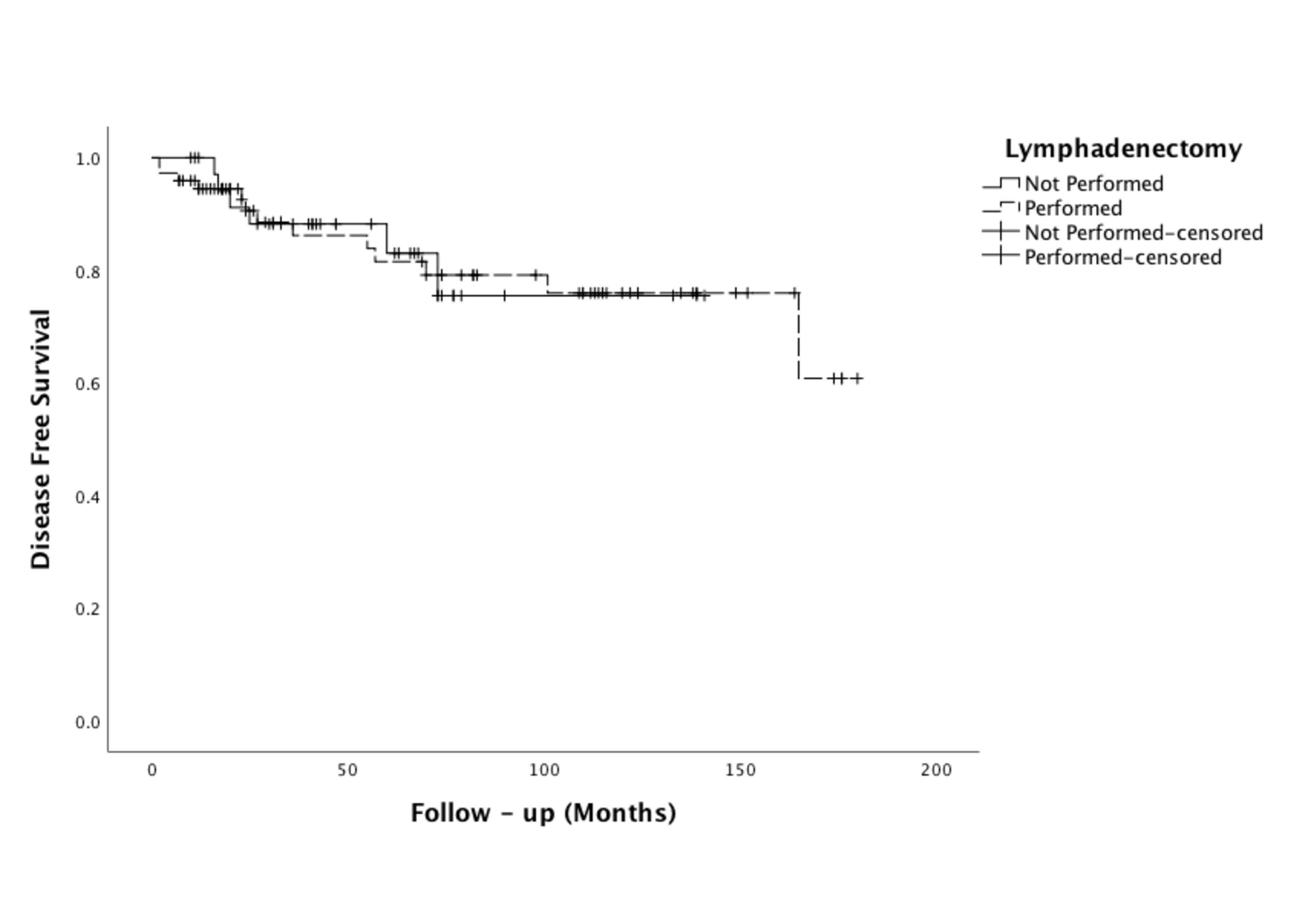 Fig. 1.DFS curve of women whether LND not performed (n = 37) or performed (n = 74). DFS, disease-free survival; LND, lymphadenectomy.