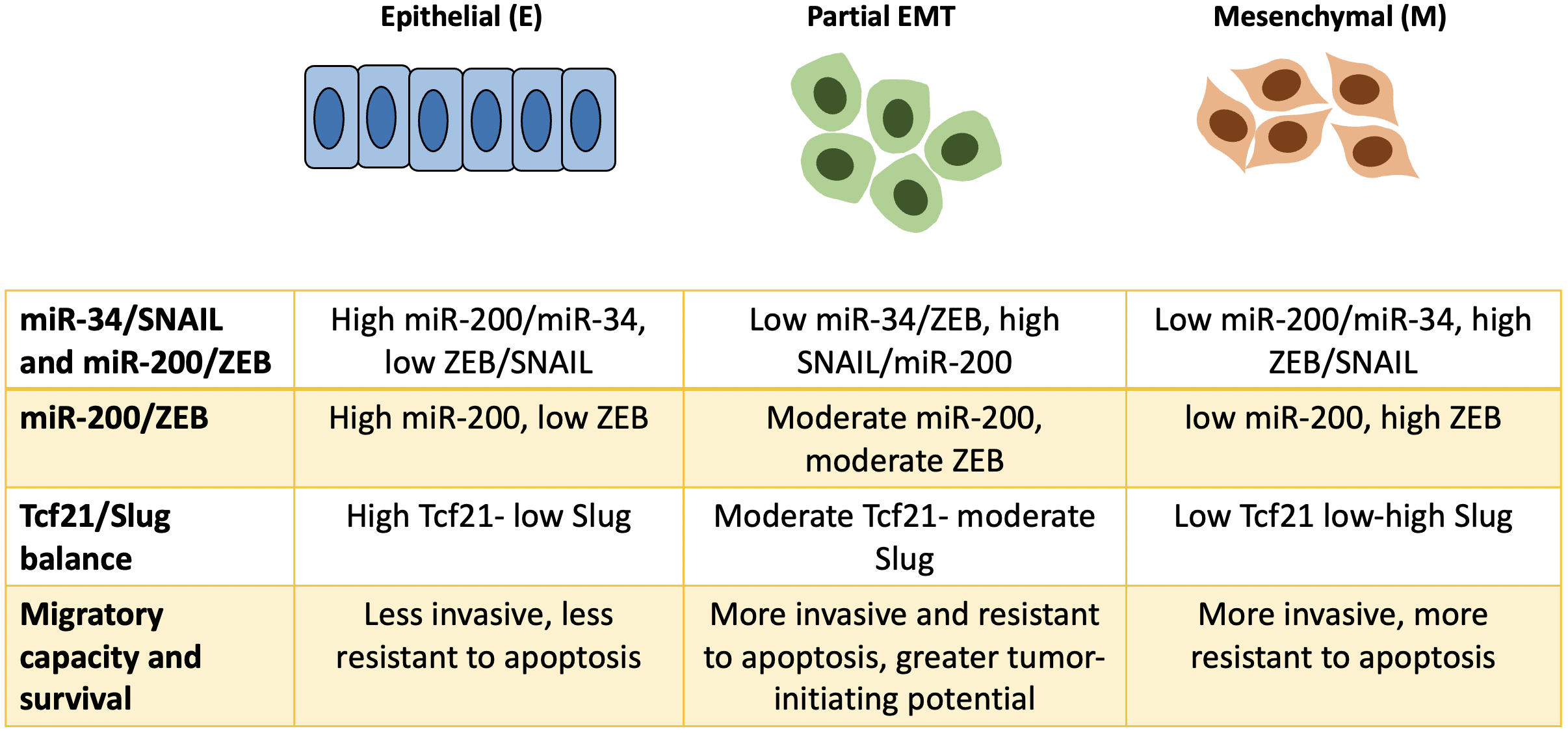 Fig. 3.Schematic illustration of dynamic regulation underlying phenotypic plasticity in EMT. A newer concept of EMT introduces the concept of partial EMT in which cancer cells exhibit both mesenchymal and epithelial characteristics. This phenotypic plasticity are determined by the balance of expression from certain TFs and their inhibitors (miRNA), such as the balance between miR-34/SNAIL and miR-200/ZEB. The expression and subcellular location of Tcf21 and Slug also influence the phenotype of cancer cells. Cancer cells undergoing partial or hybrid EMT tend to be more invasive, more resistant to apoptosis, and have greater tumor initiating potential.