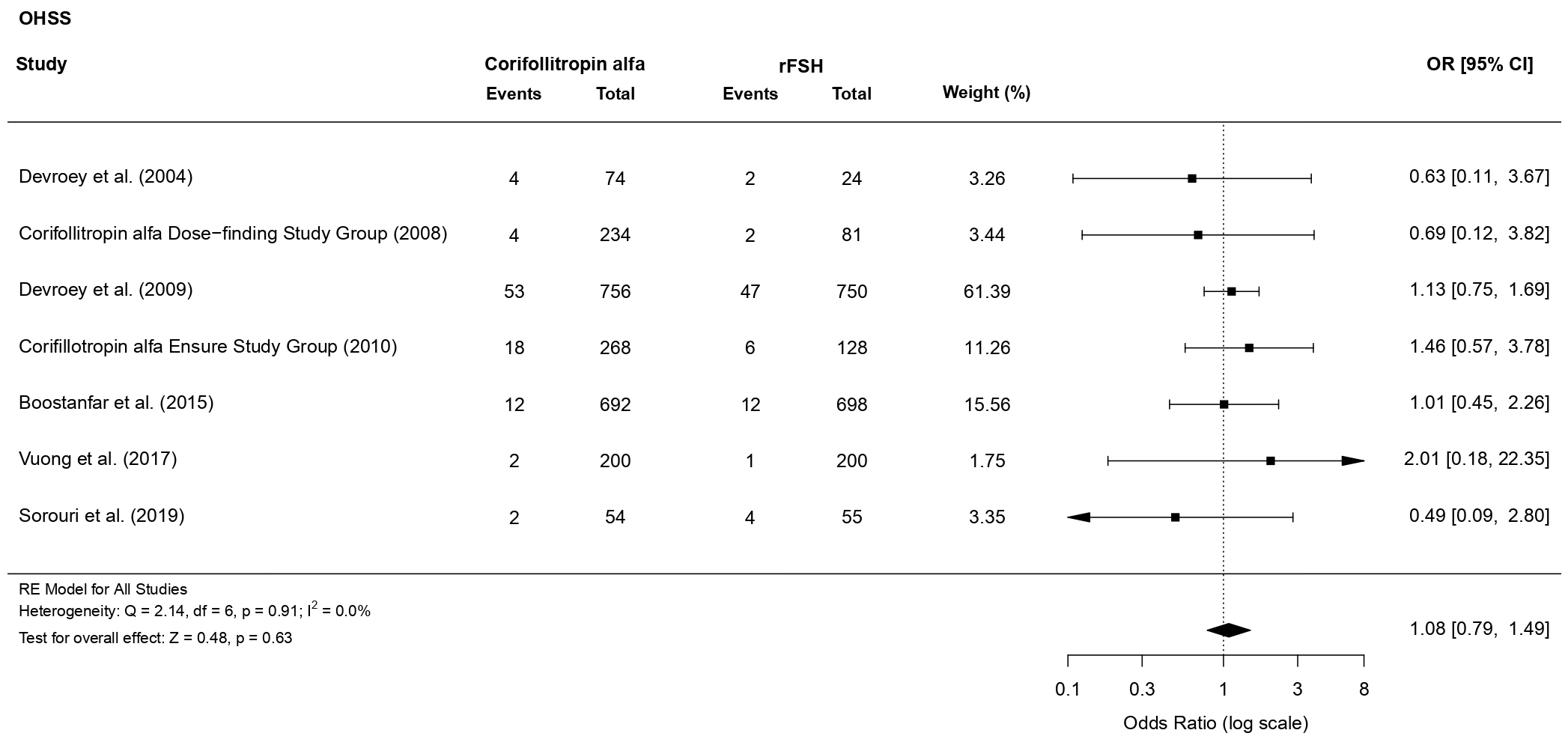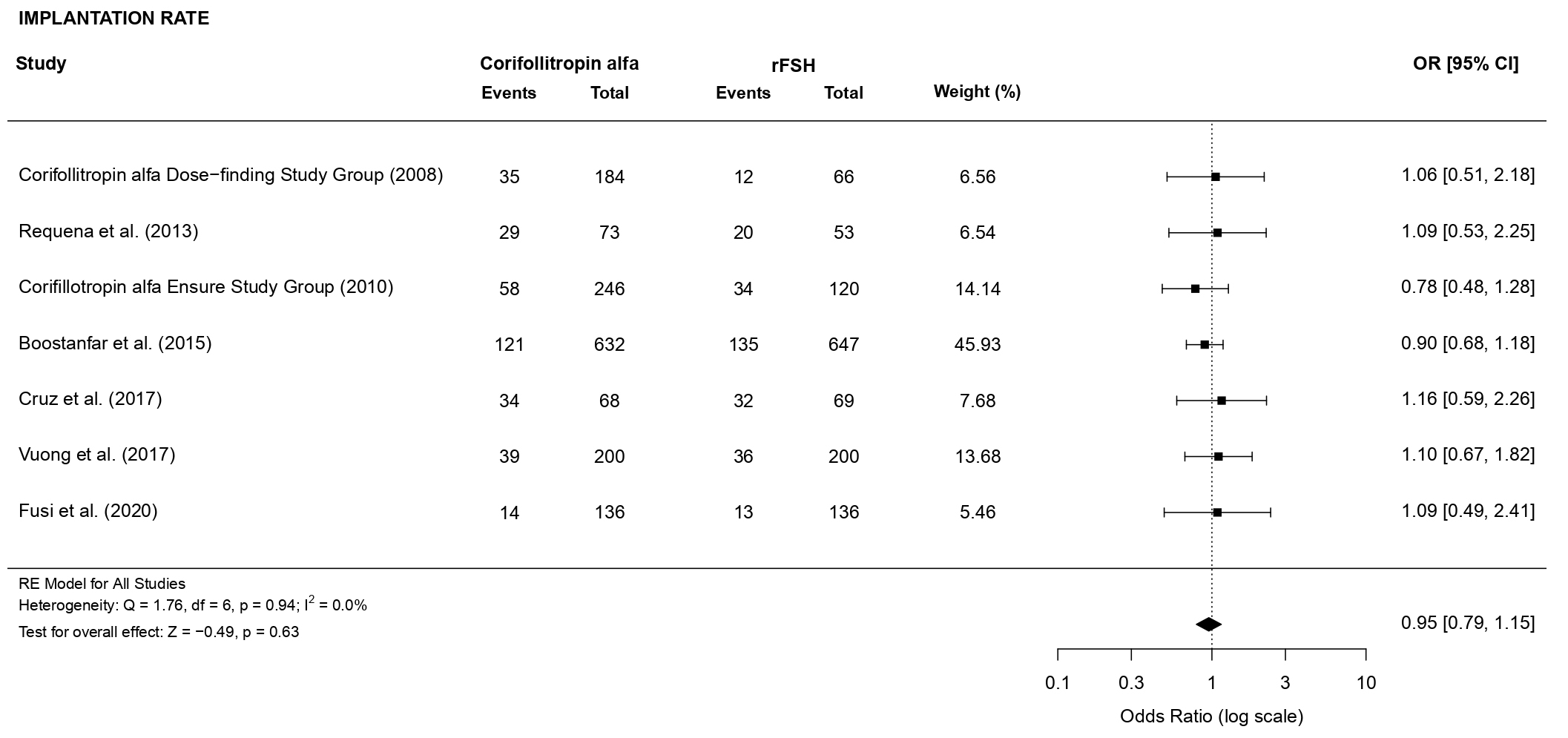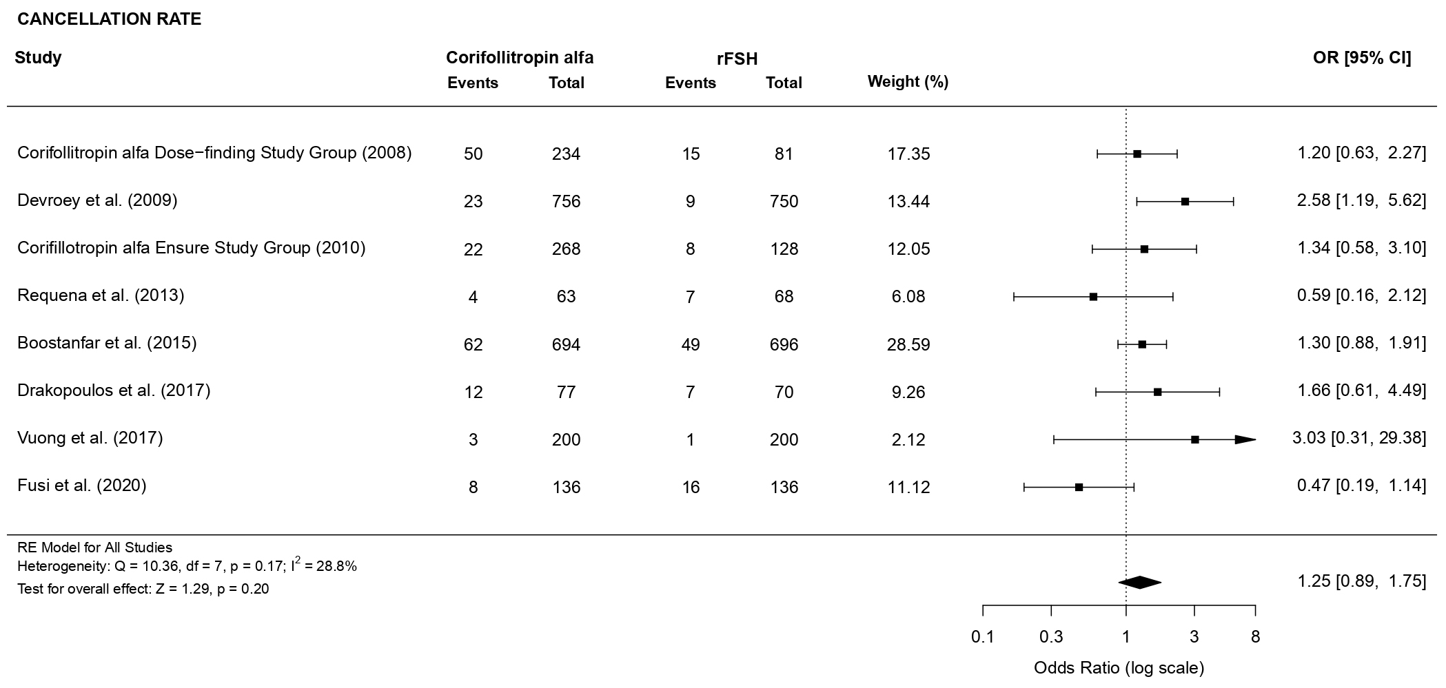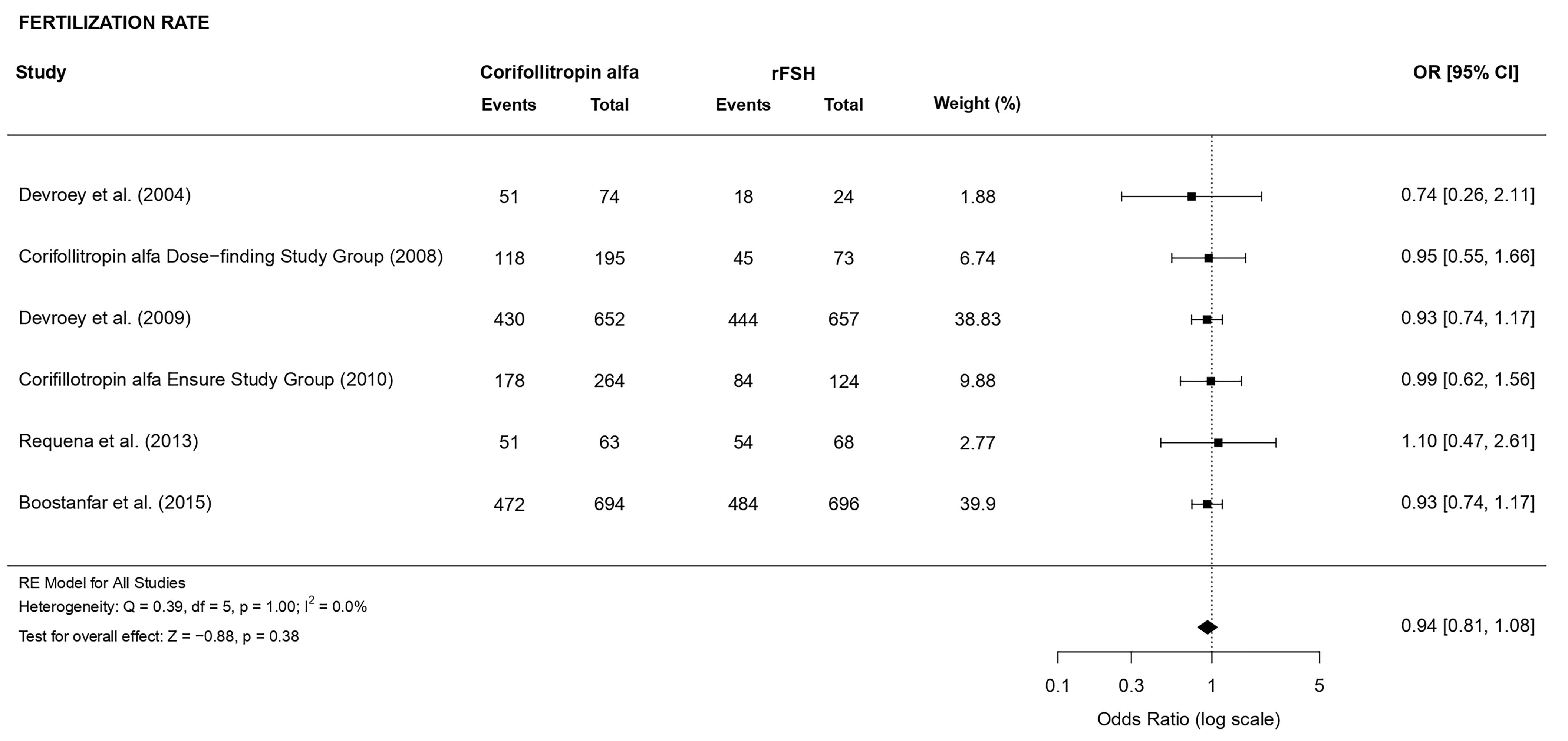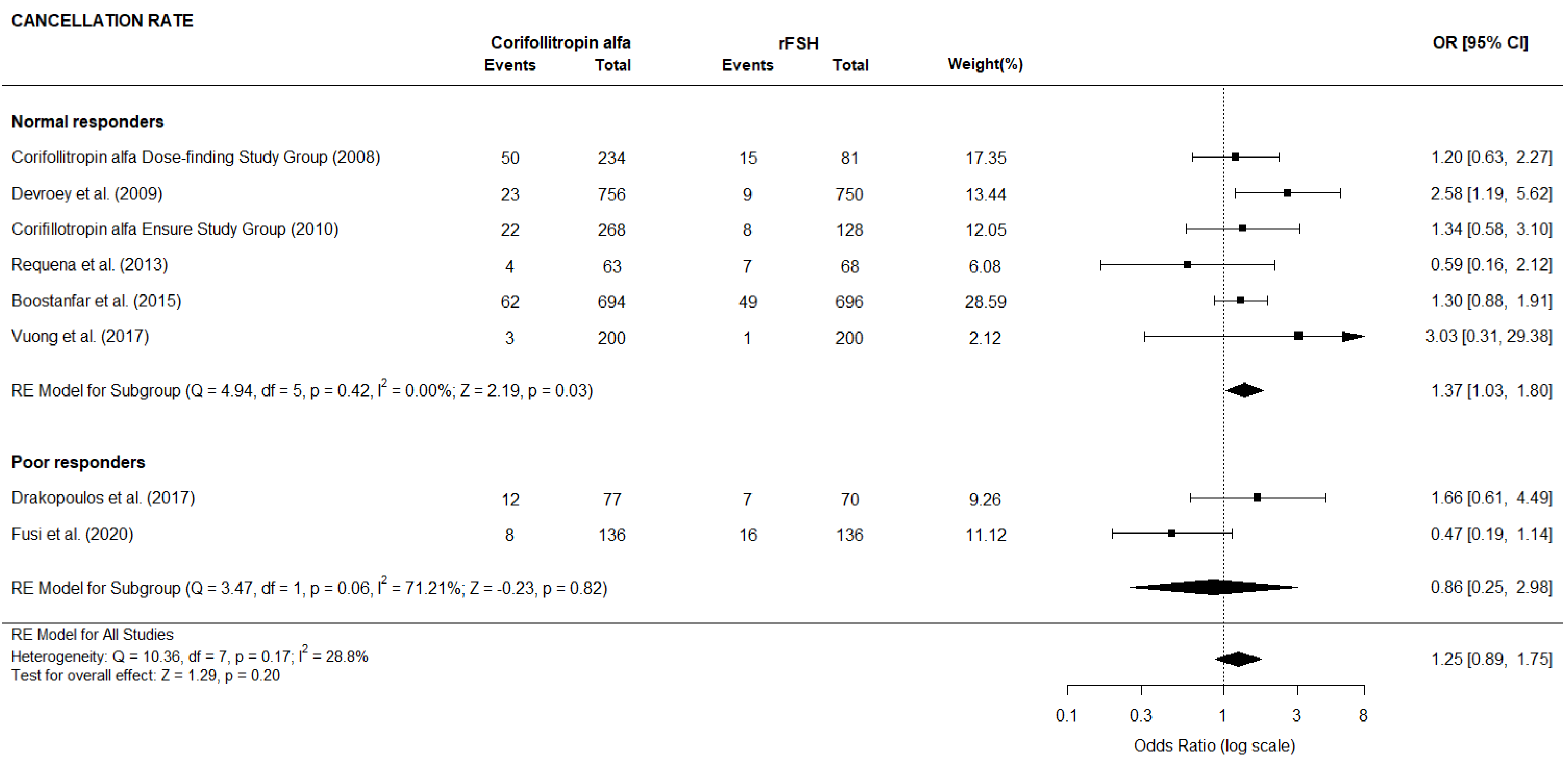 The additional considered outcomes were: total duration of stimulation, cycle cancellation rate, number of metaphase II (MII) oocytes retrieved, fertilization rate, number of embryos obtained, implantation rate, clinical pregnancy rate, ongoing pregnancy rate, live birth rate, miscarriage rate, and incidence of ovarian hyperstimulation syndrome (OHSS). Randomized controlled trials with primary endpoints different from IVF outcomes but likewise exploring the clinical parameters considered in our study were also included in the present meta-analysis.