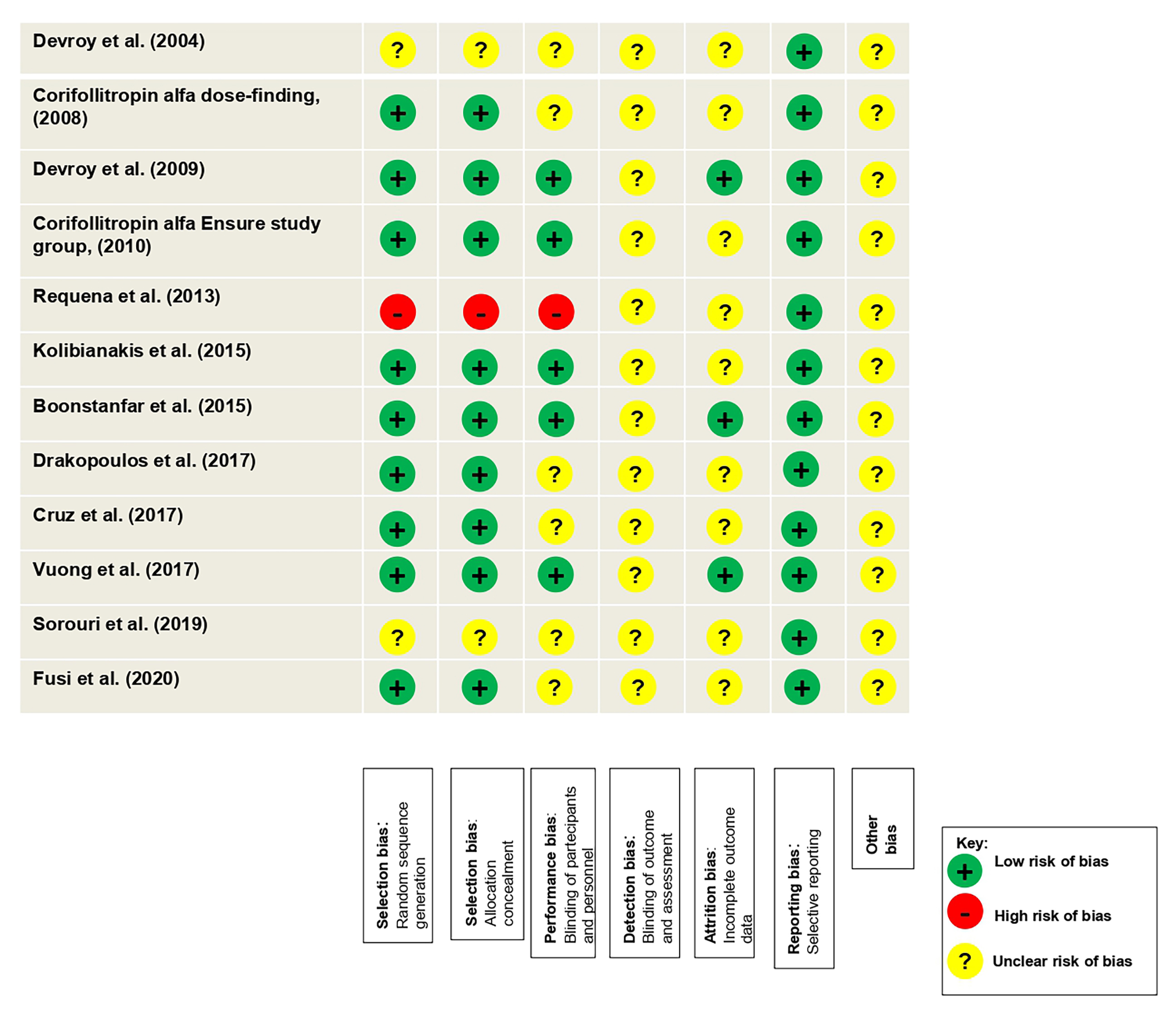 The target population was represented by infertile couples undergoing IVF/intracytoplasmic sperm injection (ICSI) or eggs donation. Only RCTs comparing CFA and daily rFSH treatments during COS and RCTs assessing the clinical effectiveness and safety of CFA were analyzed.