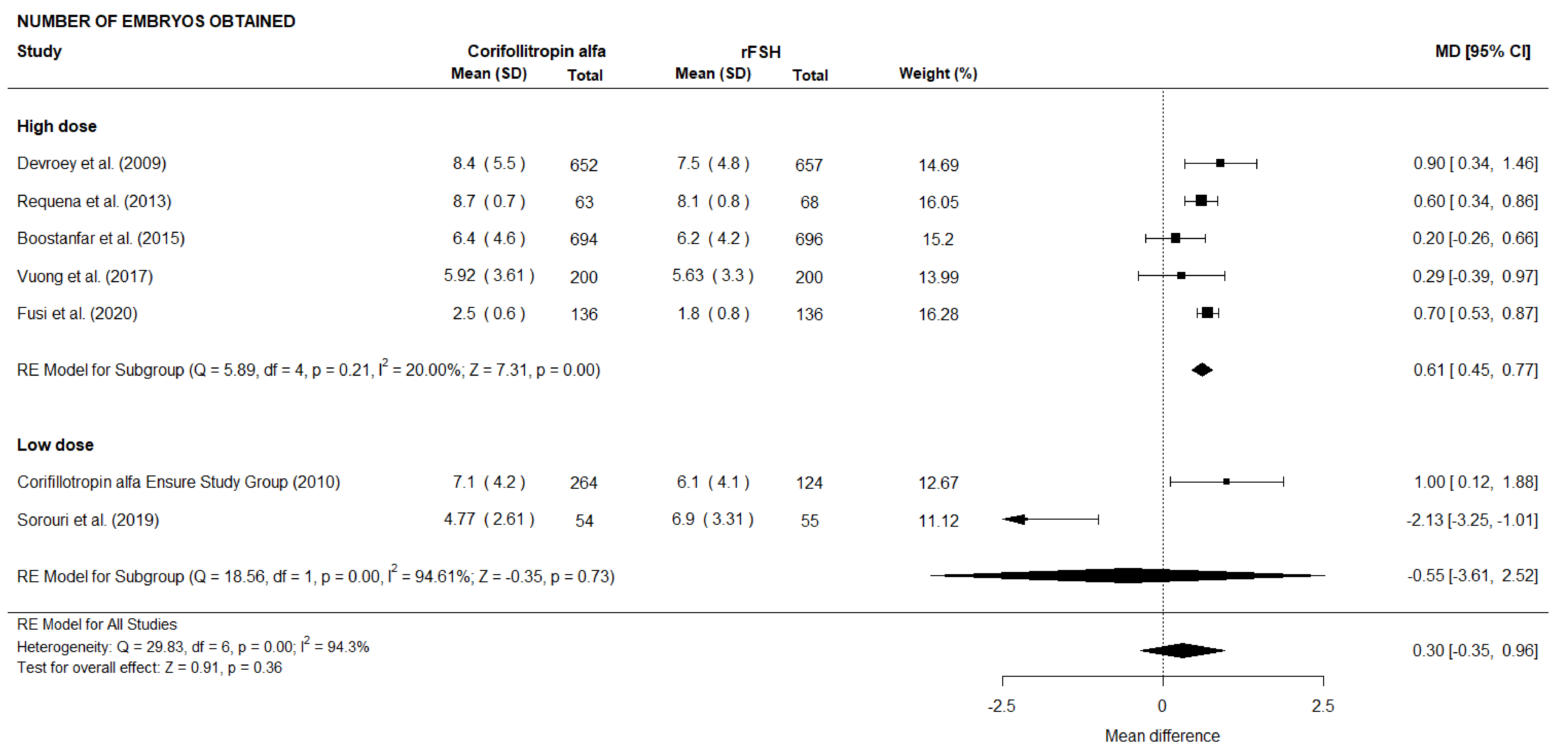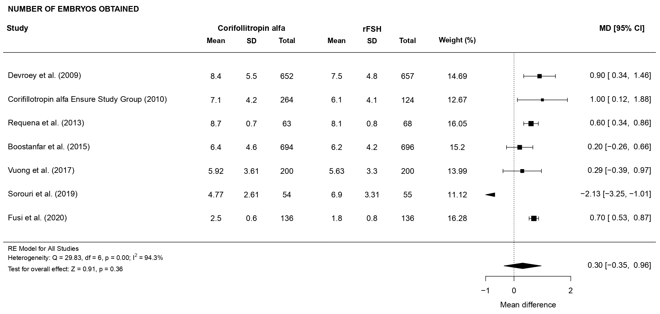 p = 0.002), and embryos obtained (MD 0.61, 95% CI [0.45, 0.77],