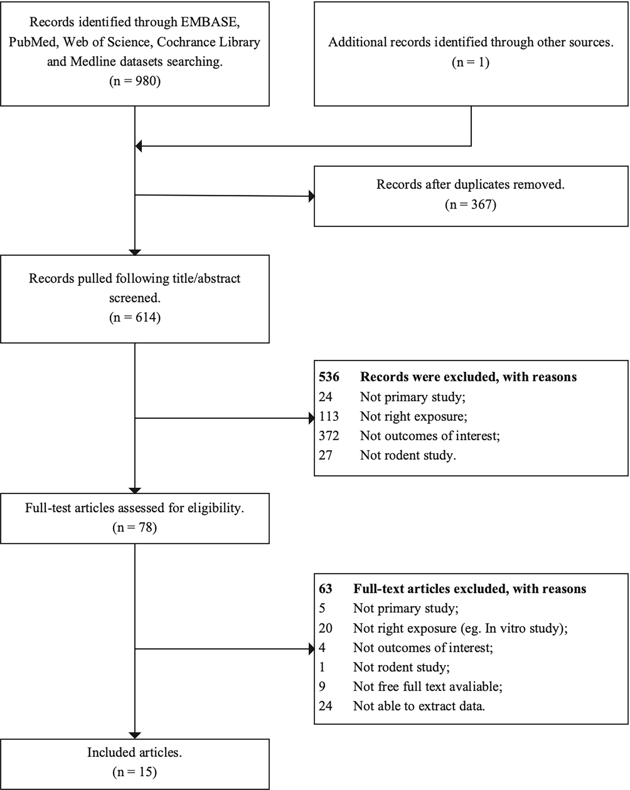 Two review observers (WH and YW) independently extracted the bibliographic data from the included studies, including the characteristics of animal model, the exposure, the study design and the relevant outcome measures (i.e., ovary weight, serum estradiol levels, serum progesterone levels, follicle counting, oocyte counting, mean estrous cyclicity, PND of puberty onset, age of VO). If disagreement occurred, two authors discussed and arrived at a consensus with the investigator (FQ). We considered each analysis of a specific outcome measure with a specific dose as a separate comparison, however, when a study was carried two or more experiments in the same condition, we would merge the data with formulae. In addition, analyses in different ovaries (even derived from the same animal) and analyses with different time windows of exposure were considered as separate comparisons. Therefore, multiple comparisons from one study were included.