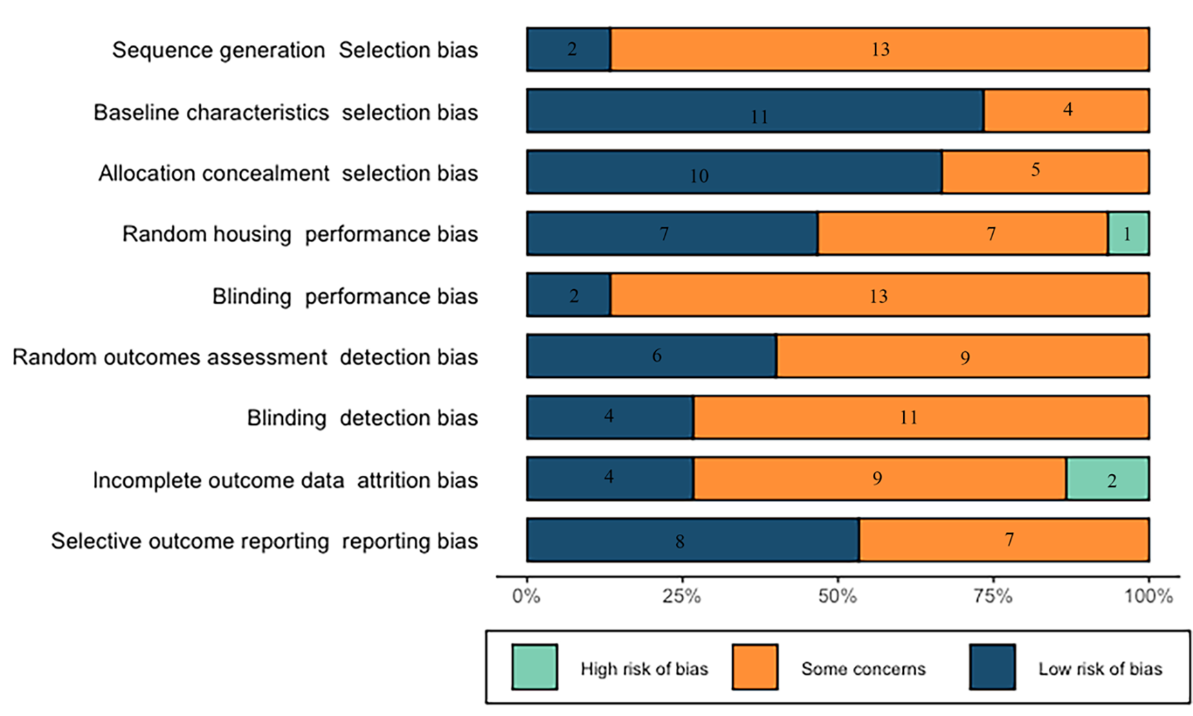 Any discrepancies were resolved among the authors to reach a consensus. If, upon further discussion, the evaluation team couldn’t reach an agreement on a risk of bias determination for a particular domain, the more conservative judgment would be selected (i.e., if one observer made a judgment of “yes” and the other made a judgment of “? / unclear”, the “? / unclear” judgment would be used). The figure of risk of bias was performed using R (version 4.1.2, R Core Team, Vienna, Austria).