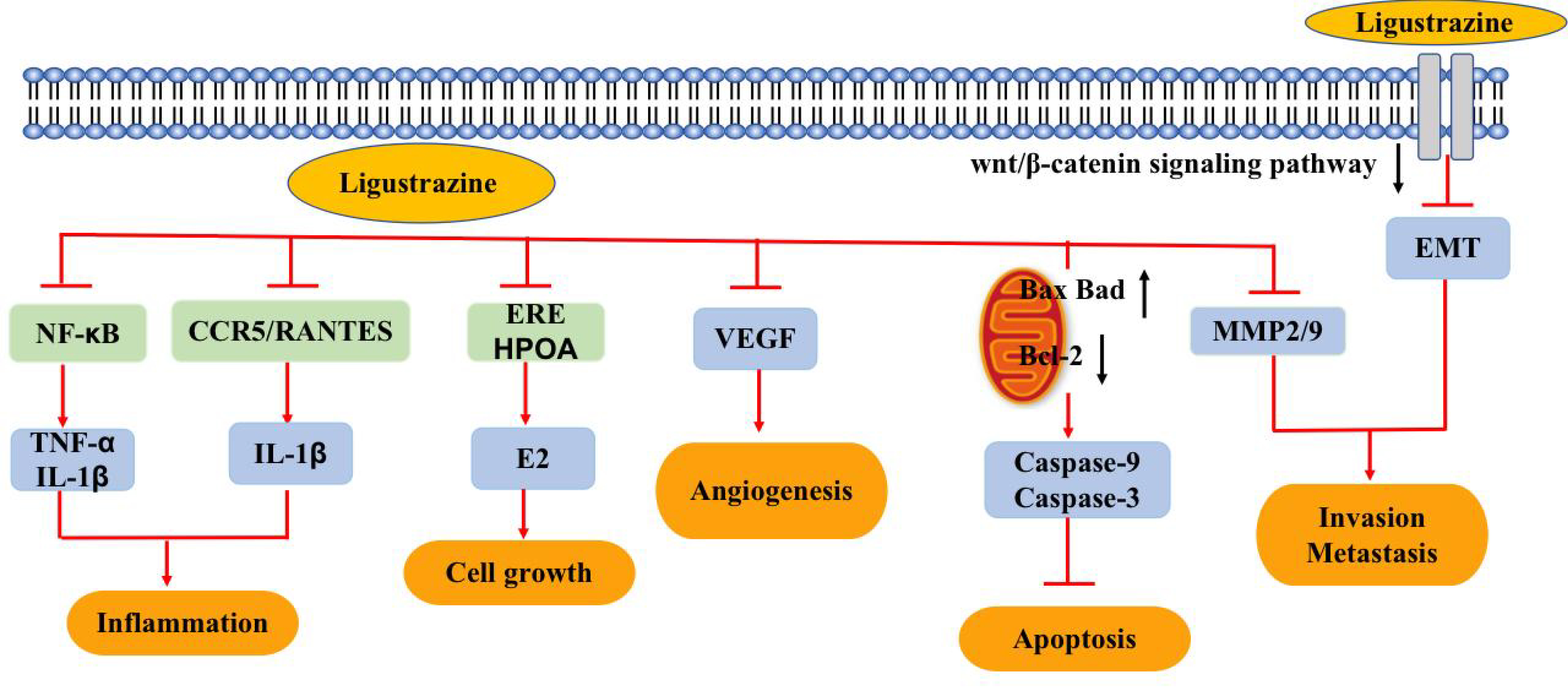 An association between inflammation and cancer is widely recognized. Interleukin-8 (IL-8) is a pro-inflammatory cytokine that is overexpressed in many malignant tumors. Anti-IL-8 antibodies have been shown to reduce tumor growth in a mouse cancer model. Merritt et al. [53] found that increased IL-8 expression was associated with poor clinical outcomes in OC and that IL-8 gene silencing could inhibit tumor growth, suggesting IL-8 may be a potential therapeutic target for OC. Yin et al. [54] confirmed that ligustrazine can reduce IL-8 expression through the ERK1/2, p38 and AP-1 signaling pathways, thus inhibiting the invasion and migration of human SKOV3 cells. Another study showed that ligustrazine inhibits the migration of SKOV3 cells induced by IL-8, which may be related to changes in E-cadherin and MMP-9 protein expression [55]. Following inhibition of IL-8 expression by ligustrazine, the expression of MMP-9 decreased and the expression of E-cadherin increased, thereby inhibiting the invasion and metastasis of human SKOV3 OC cells.