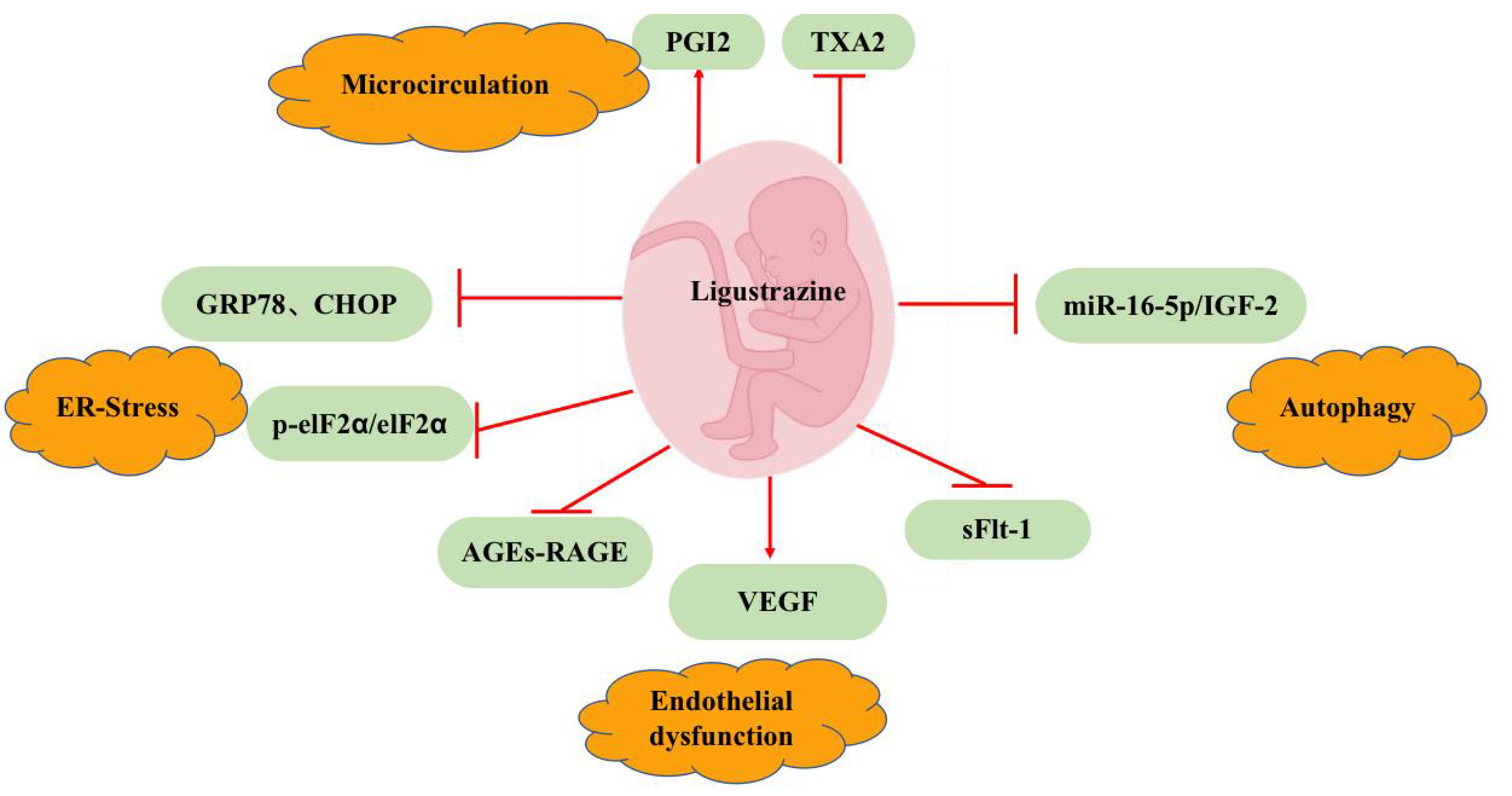 Fig. 2.Pharmacological effects of ligustrazine on preeclampsia. Ligustrazine has anti-preeclampsia effects through the regulation of trophoblast function, inhibition of ER stress, improved endothelial function, dilation of blood vessels, and improve microcirculation. Abbreviations: IGF, insulin-like growth factor; sFlt-1, soluble Fms-like tyrosine kinase 1; AGES, advanced glycosylation end products; RAGE, receptor of AGEs; GRP78, Glucose regulating protein 78; CHOP, human endoplasmic stress-related proteins; PGI2, prostacyclin I2; TXA2, thromboxane A2; VEGF, vascular endothelial growth factor; eIF2α, α subunit of eukaryotic initiation factor 2; p-eIF, phosphorylated eIF2α.