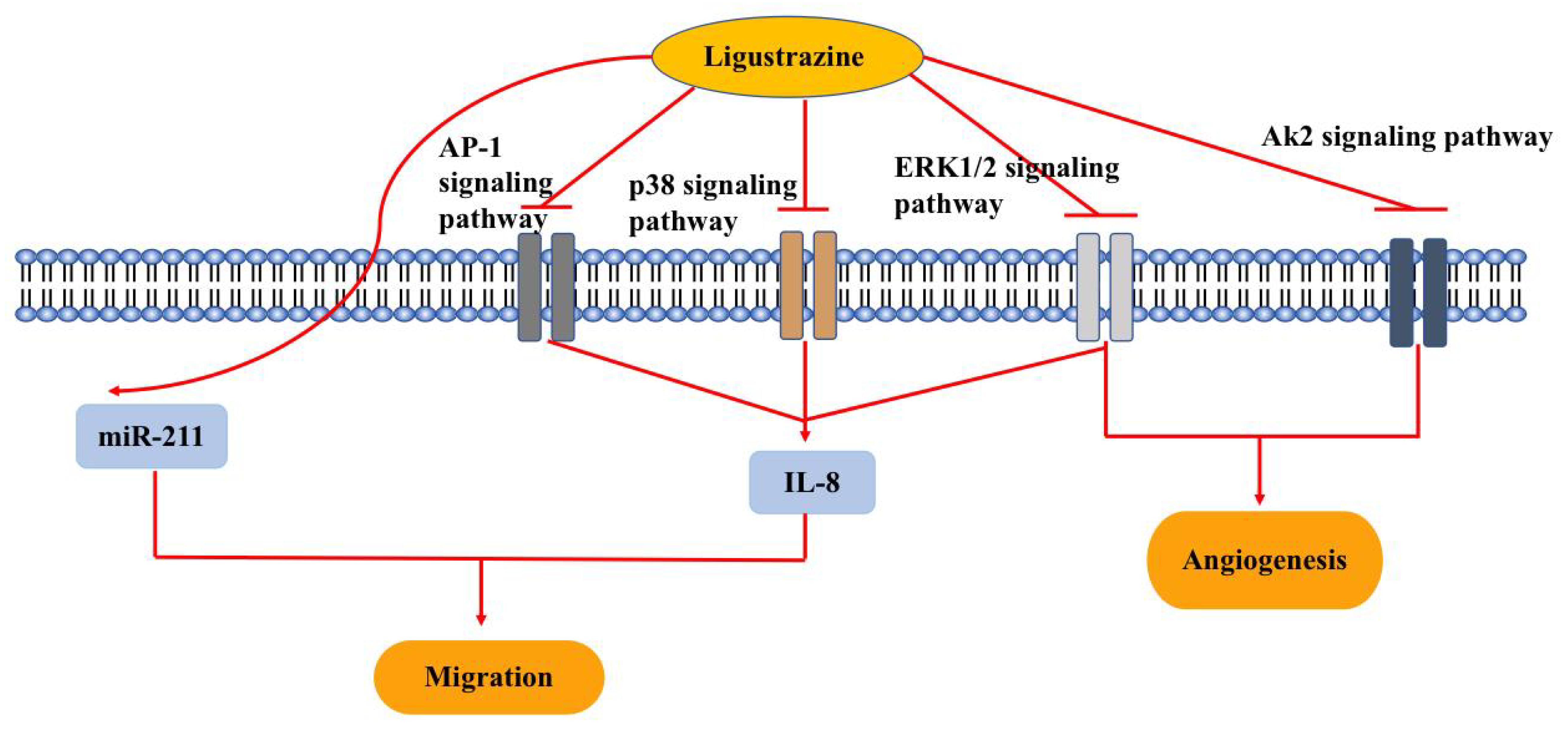 Fig. 3.Pharmacological effects of ligustrazine on ovarian cancer (OC). Ligustrazine reverses chemotherapy resistance, inhibits cell migration and angiogenesis through multiple signaling pathways, including Ak2, ERK1/2, p38 and AP1. Abbreviations: ERK, extracellular regulated protein kinases; AP, activator protein-1; AK, adenylate kinase; miR, microRNA; IL, interleukin.