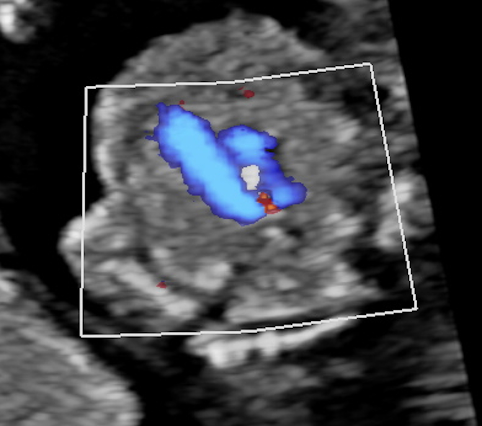 (4) Two-dimensional and color-flow images of the 4-chamber cardiac view, the left ventricular outflow tract (LVOT) view, and the three-vessel-tracheal (3VT) view to examine the lungs, the fetal heart chambers, and great vessels.