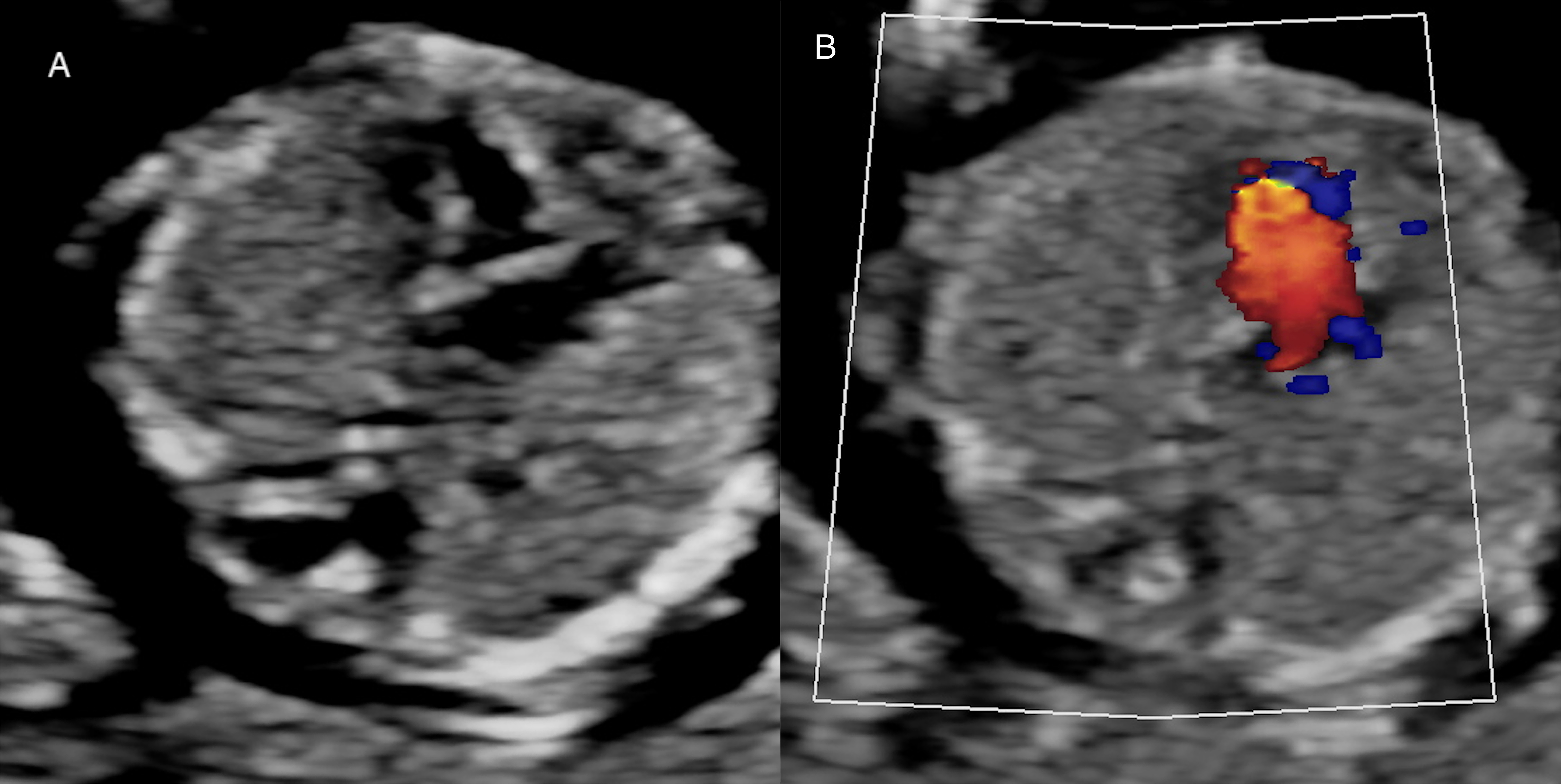 Fig. 3.HLHS in a 13w1d fetus. (A) The 4-chamber view showing the significantly reduced left atrium and left ventricle. (B) Color Doppler showing only blood flow from the right atrium to right ventricle on the 4-chamber view. HLHS, hypoplastic left heart syndrome.