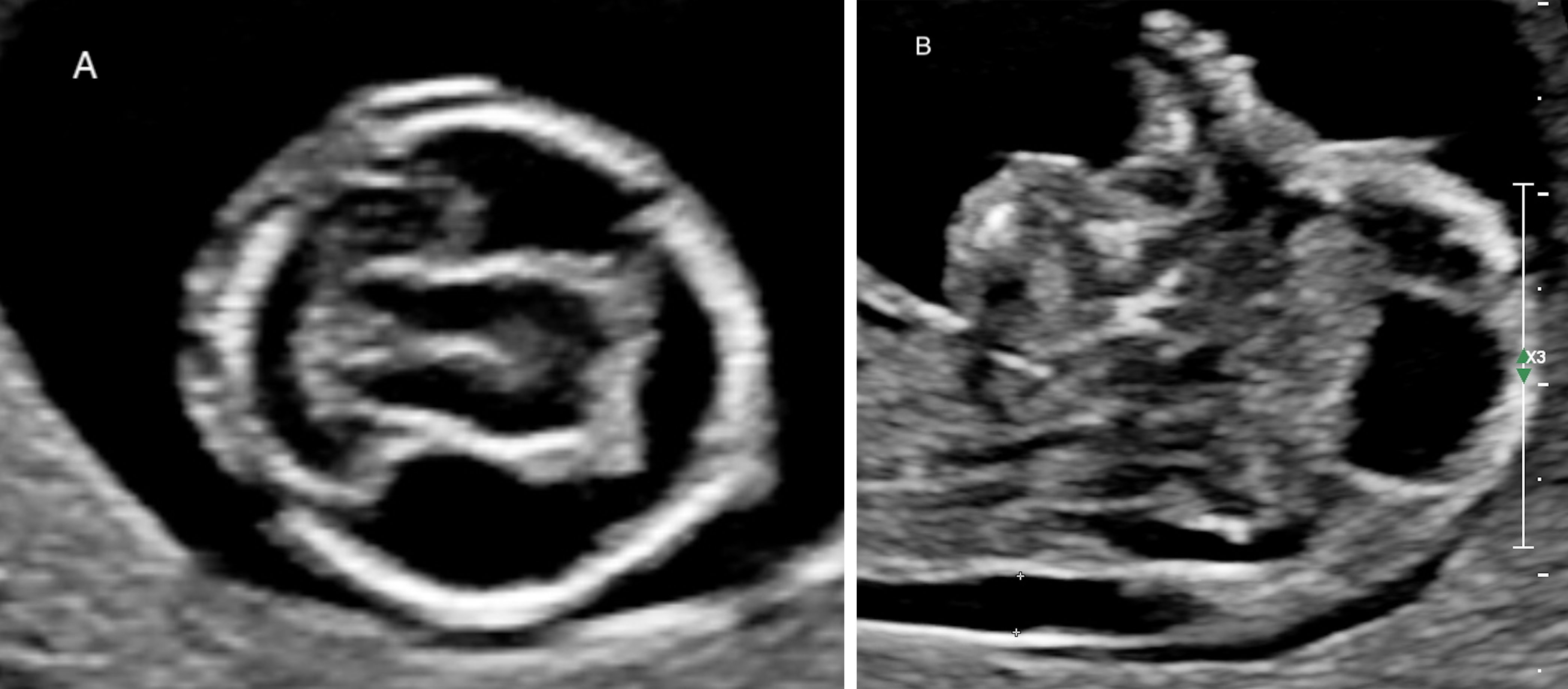 Fig. 5.Alobar holoprosencephaly in a 13w4d fetus. (A) Transverse section showing a single ventricular cavity in the fetal head. (B) Midsagittal section showing the abnormal face.