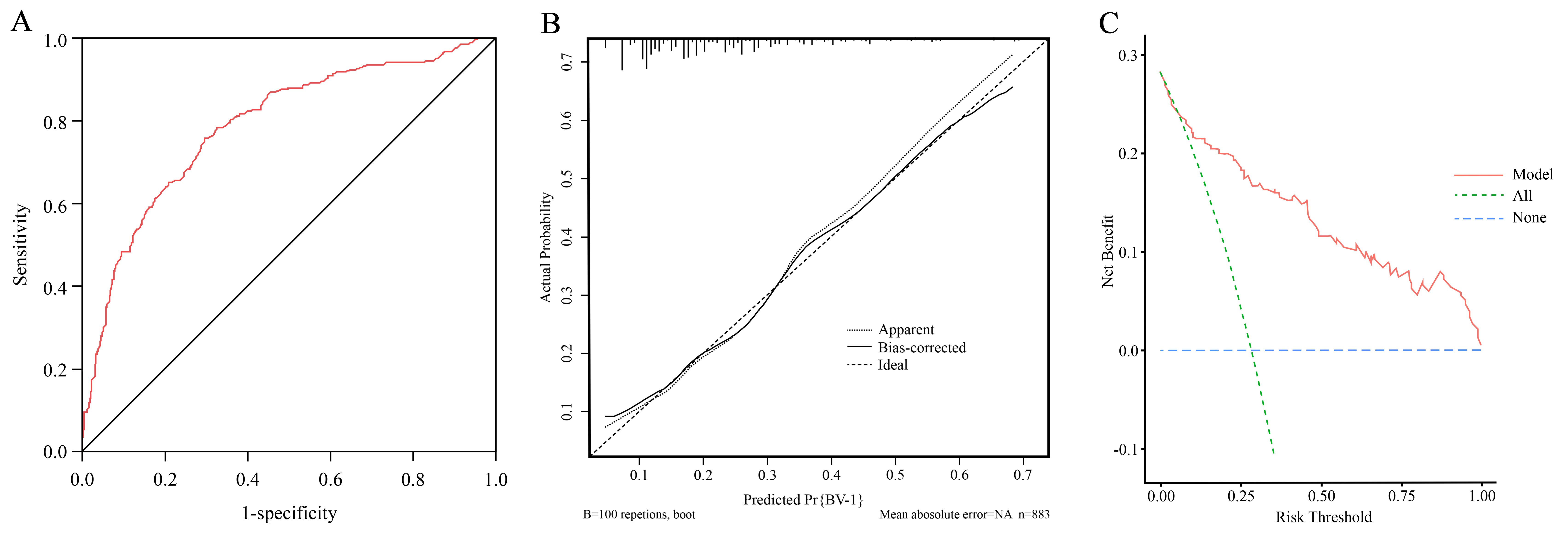 Fig. 2.Verification of nomogram model. (A) ROC curve analysis of nomogram model for predicting BV risk. (B) Calibration curve of nomogram model. (C) DCA curve of BV infection risk nomogram prediction model. ROC, receiver operating characteristic; BV, bacterial vaginosis; DCA, decision curve analysis
