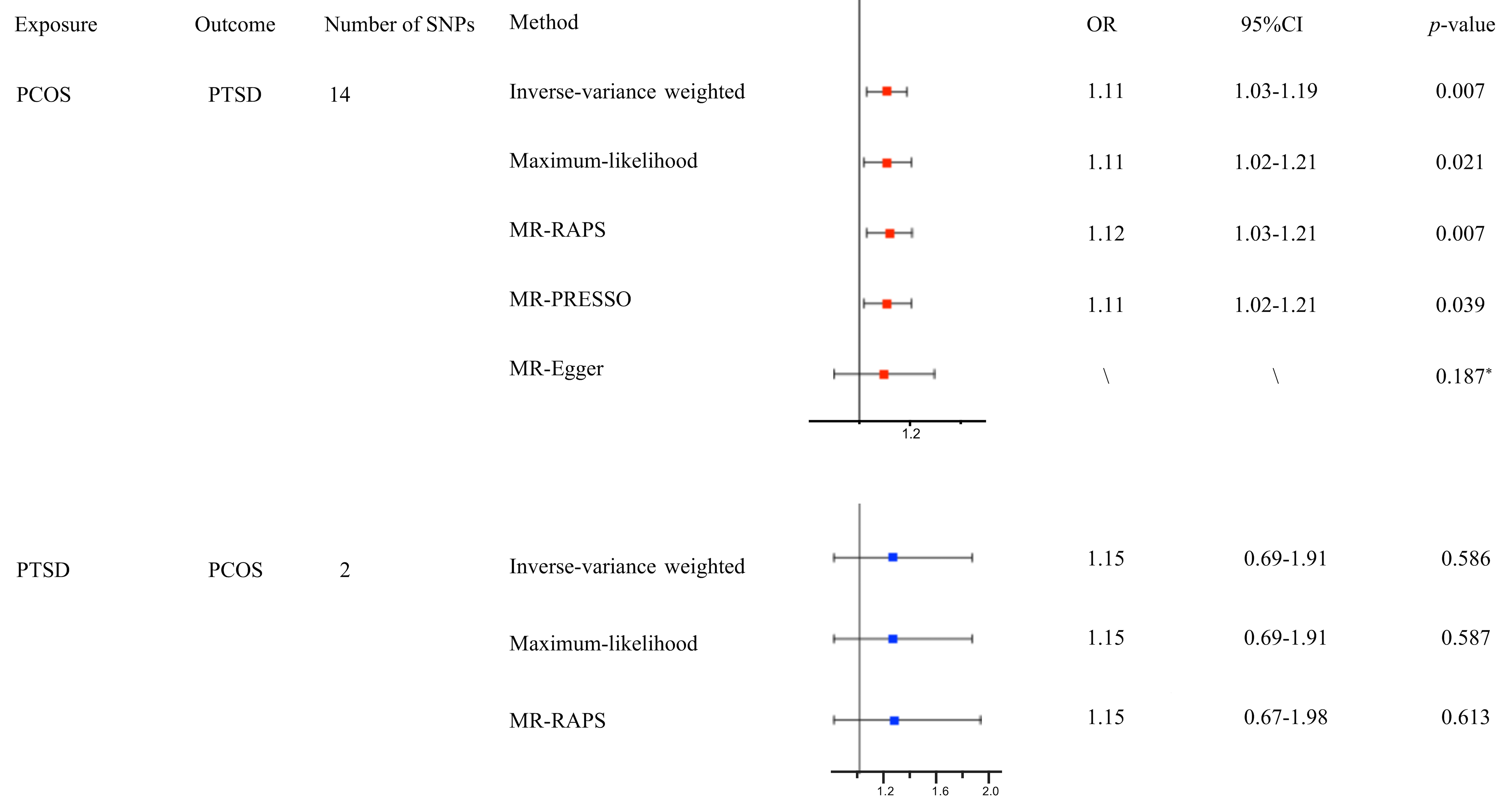 Fig. 2.MR effect estimates for associations of exposures with the risk of outcomes. *p-value of the intercept from MR-Egger regression. SNP, single nucleotide polymorphism; MR-RAPS, Mendelian randomization-Robust Adjusted Profile Score; MR-PRESSO, MR Pleiotropy RESidual Sum and Outlier; PCOS, polycystic ovary syndrome; PTSD, post-traumatic stress disorder; OR, odds ratio; CI, confidence interval.