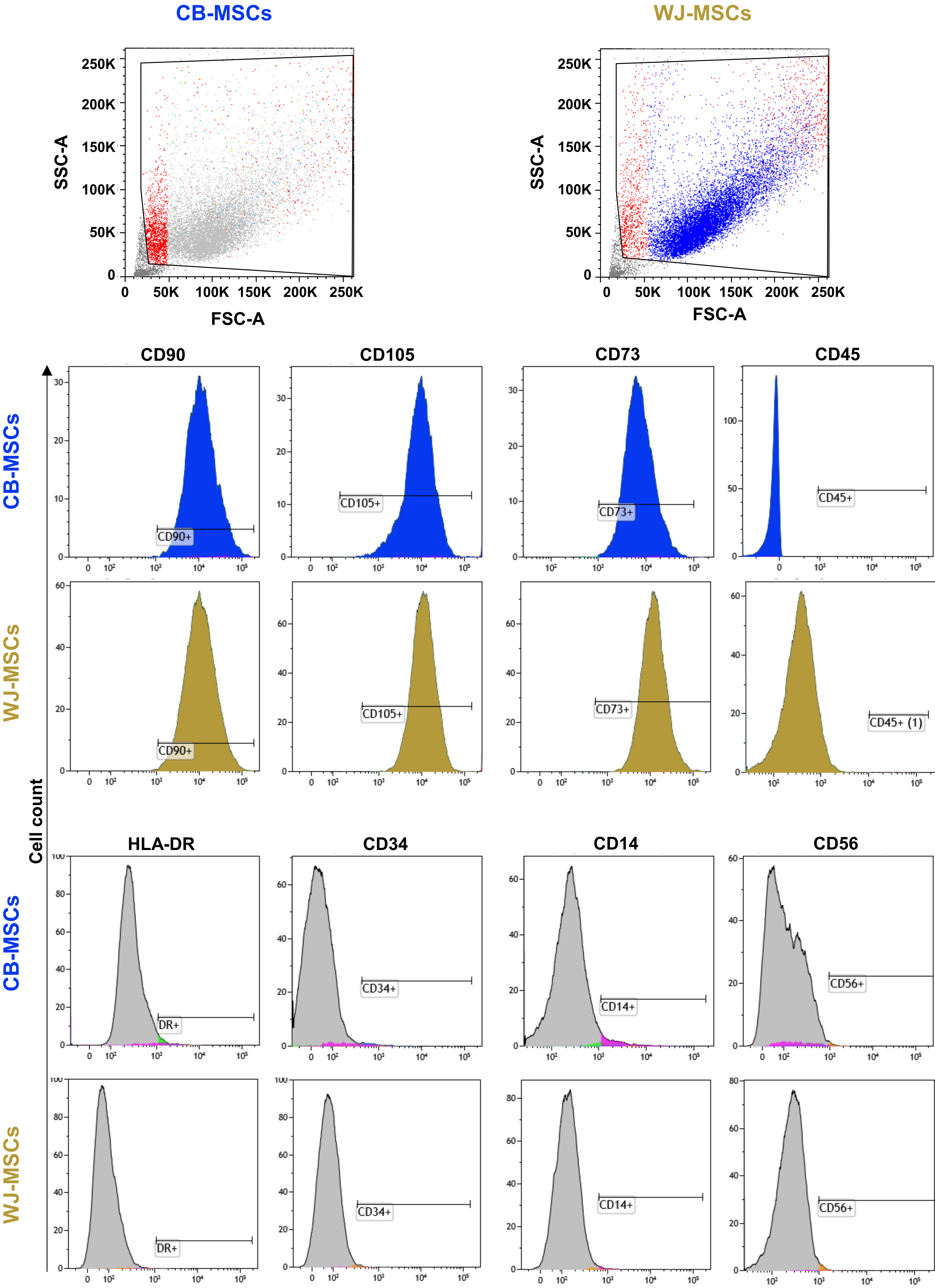 Fig. 3.Cord blood derived (CB-MSCs) and Wharton’s Jelly-derived mesenchymal stem cell (WJ-MSCs) immunophenotype. Flow cytometry analysis was performed on CB- and WJ-MSCs, and cells were positive for mesenchymal markers, such as CD90, CD73, and CD105, and negative for lineage-specific markers, such as HLA-DR, CD45, CD34, CD14, and CD56. SSC-A, side scatter area; FSC-A, forward side scatter-area; CD, cluster of differentiation.
