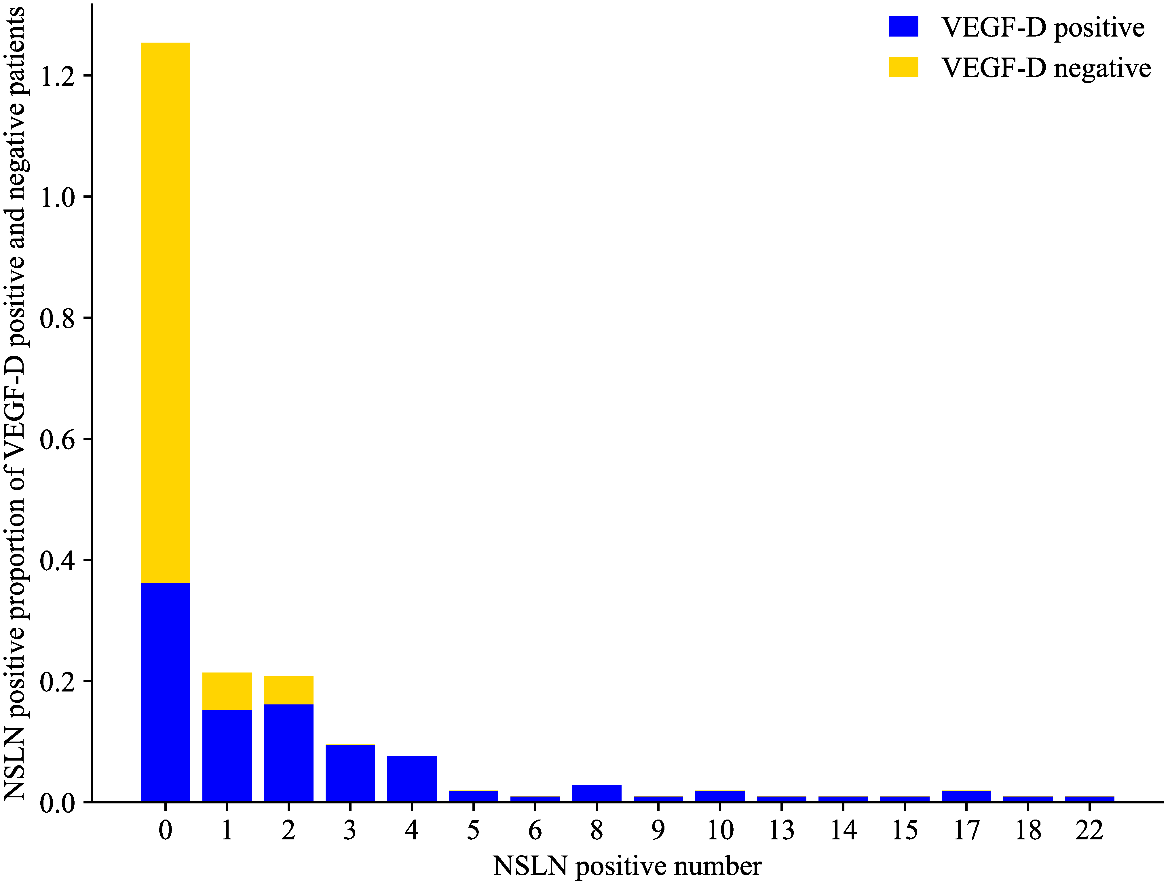 Fig. 3.Proportion of NSLN-positive patients among VEGF-D-positive and -negative patients. VEGF, vascular endothelial growth factor; NSLN, nonsentinel lymph node.