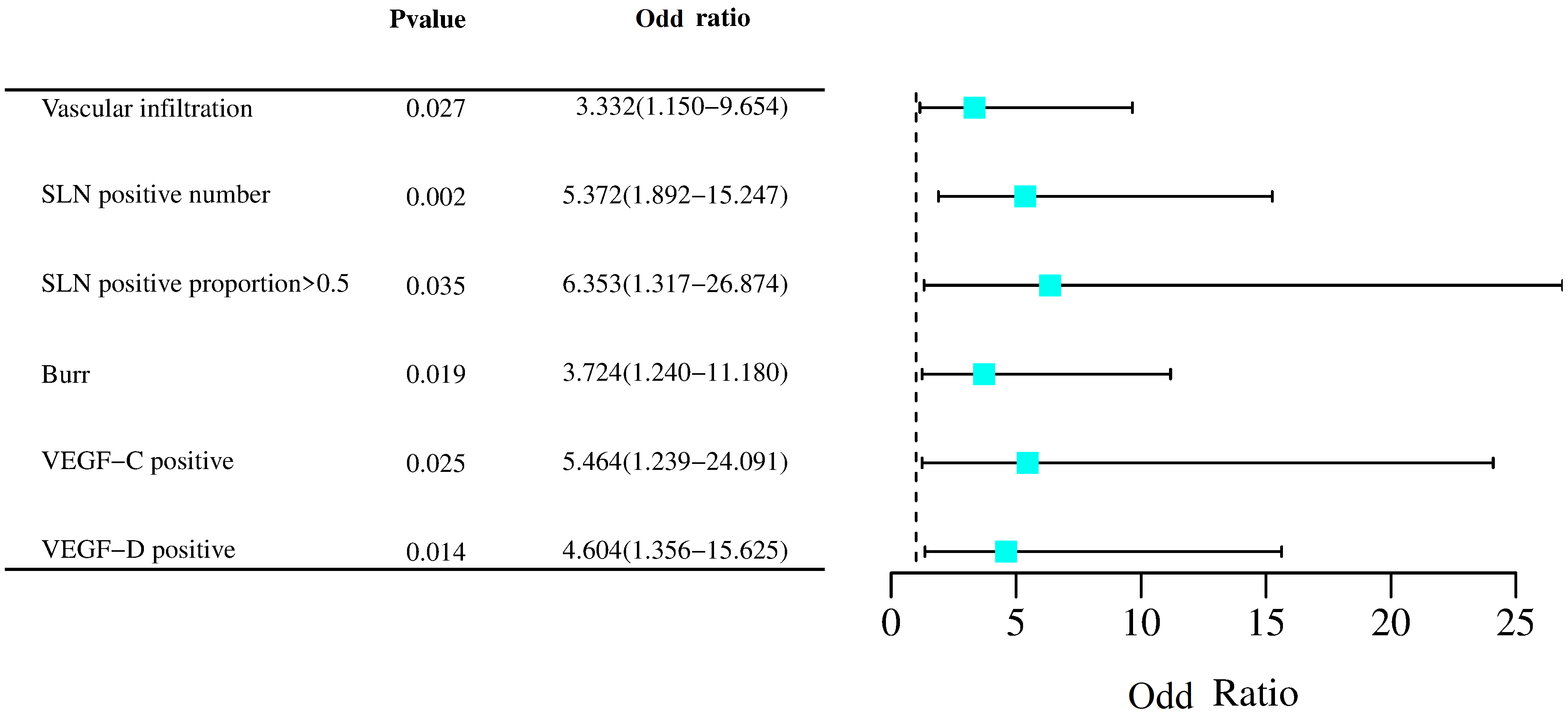 Fig. 4.Forest plot of risk factors for NSLN metastasis. SLN, sentinel lymph nodes; VEGF, vascular endothelial growth factor.
