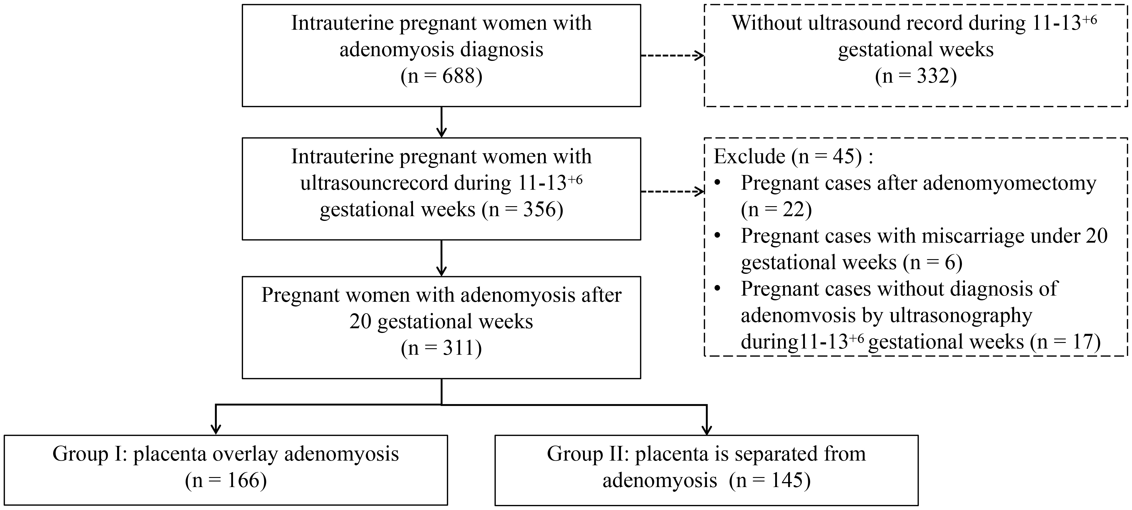 group 2, placenta located far away from the adenomyotic lesion. The clinical data