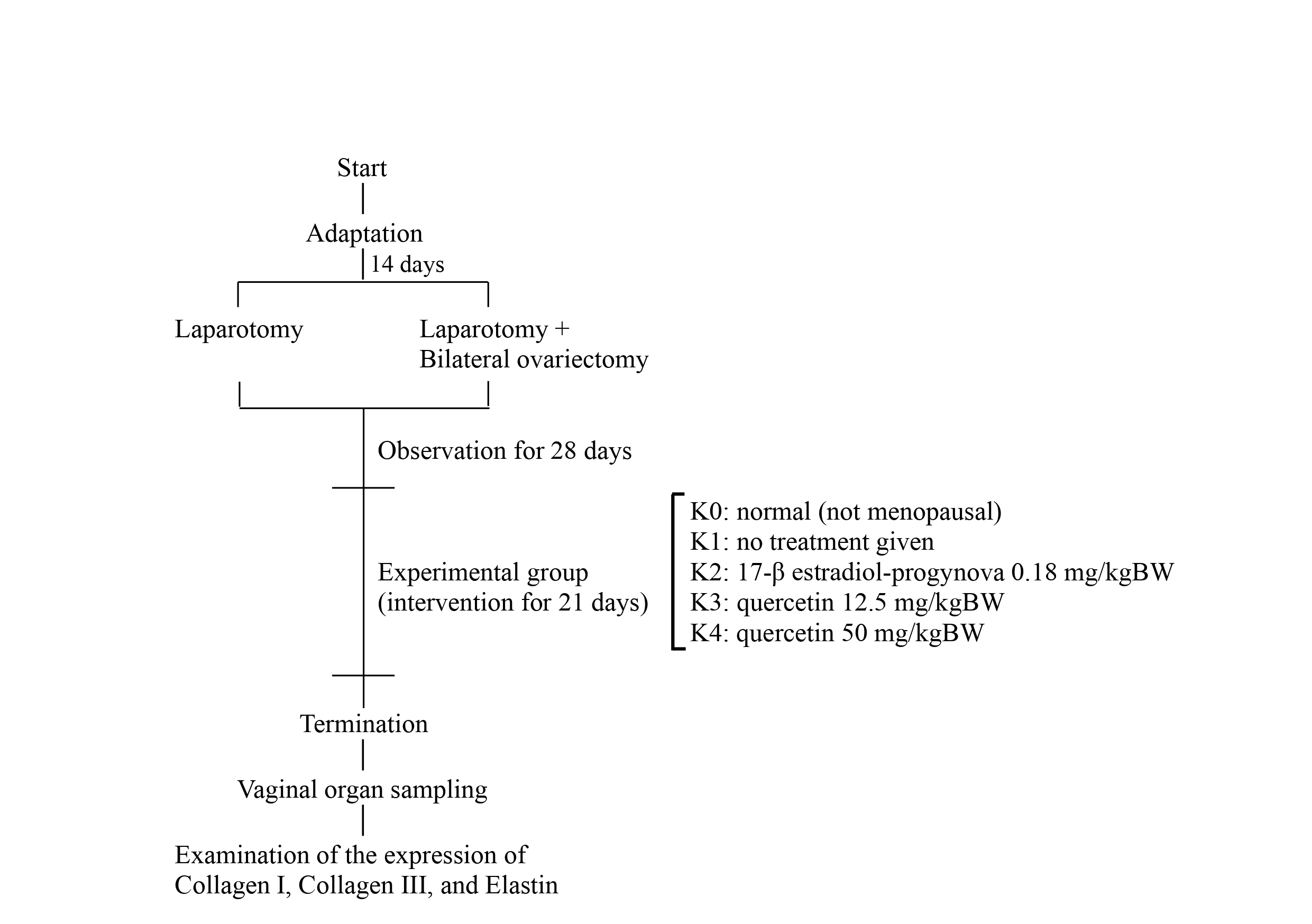 This study's research design was an in vivo randomized control group post-test. The research was conducted at the animal laboratory, Faculty of Medicine, Universitas Airlangga. Rattus norvegicus, used in the study, were divided into 5 groups: normal rat, menopausal model without treatment, menopausal model given 17-β estradiol valerate 0.18 mg/kg, quercetin 12.5 mg/kg, and quercetin 50 mg/kg. The effectiveness of therapy was assessed from the immunohistochemical expression of collagen I, collagen III, and elastin in vaginal tissue.