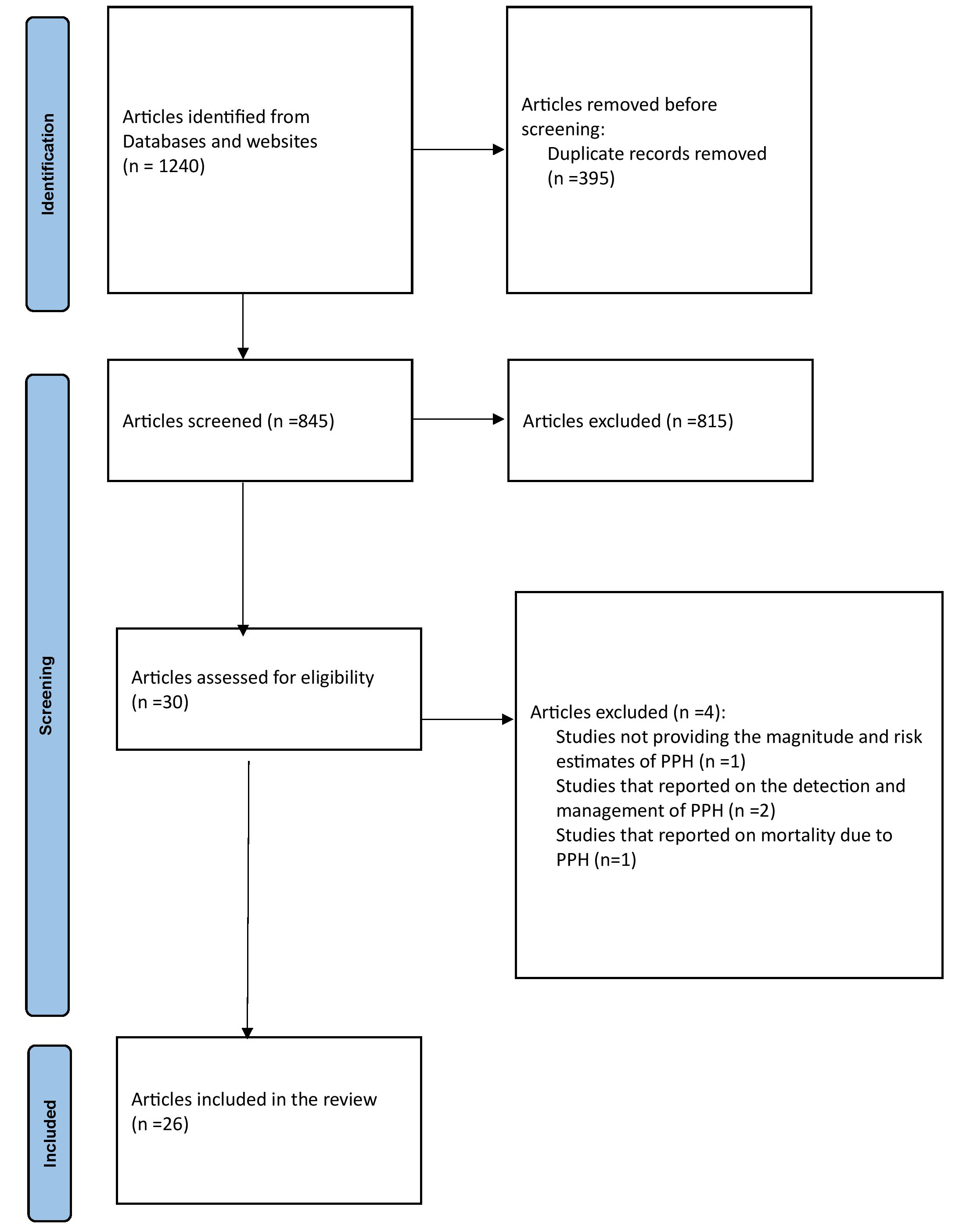 We retrieved 1240 articles from all the databases and websites searched. After removing duplicates (n = 395), 845 articles remained. Of these, 815 were excluded due to being published before 2013, being qualitative studies, or being systematic reviews and meta-analyses. Following the eligibility assessment of the remaining 30 articles, 4 were excluded, as illustrated in Fig. 1. 2 excluded articles [21, 22] focused solely on the detection and management of PPH, 1 [23] addressed PPH mortality, and 1 [24] lacked data on the prevalence of PPH or risk estimates.