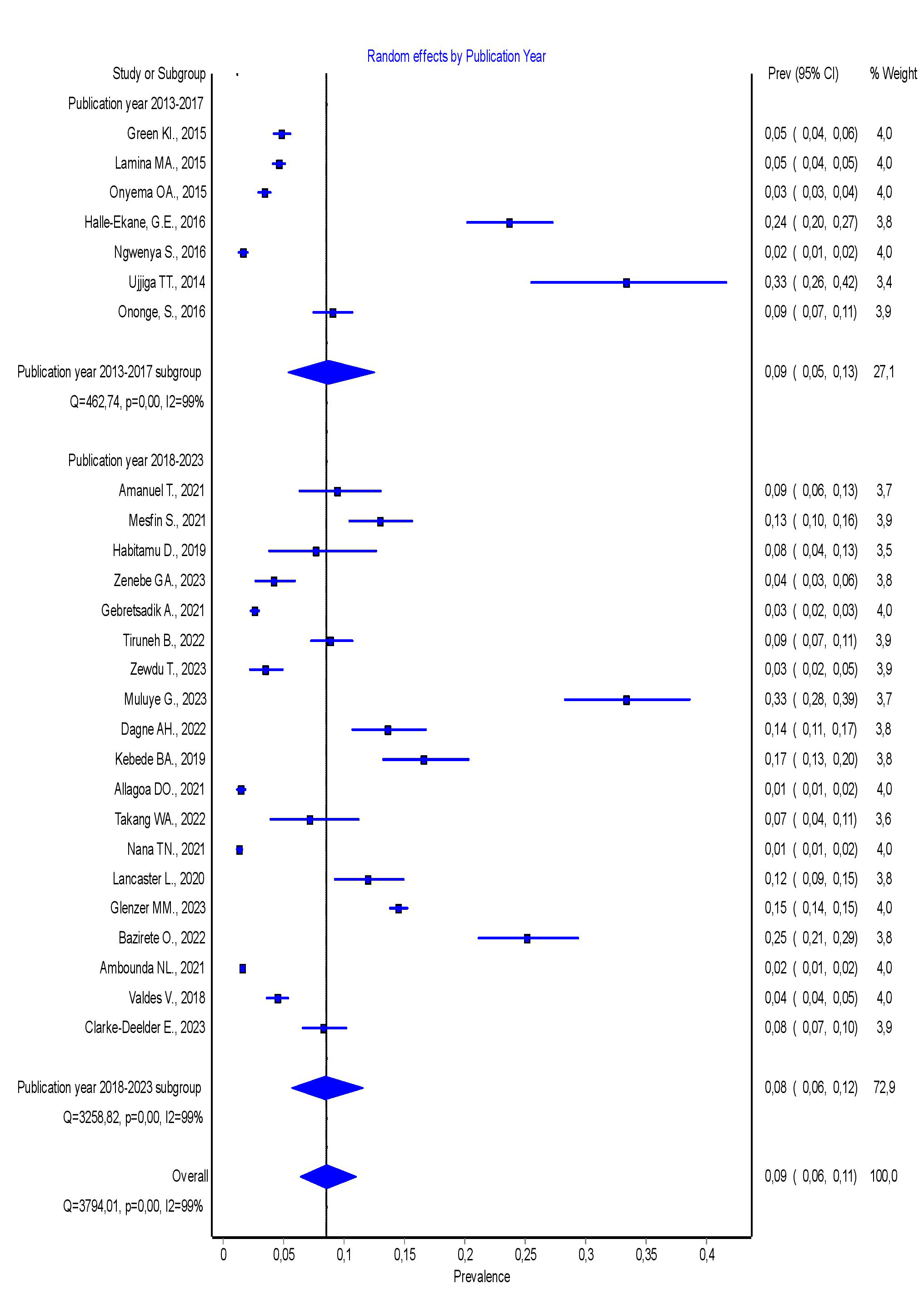 The subgroup analysis by publication year revealed that the pooled prevalence of PPH was 9% (95% CI = 5–13%) for studies published in 2013–2017, and 8% (95% CI = 6–12%) for studies published in 2018–2023. There was no statistically significant difference in the pooled prevalence of PPH between studies published from 2013–2017 and those published from 2018–2023. Further details are presented in Fig. 3.