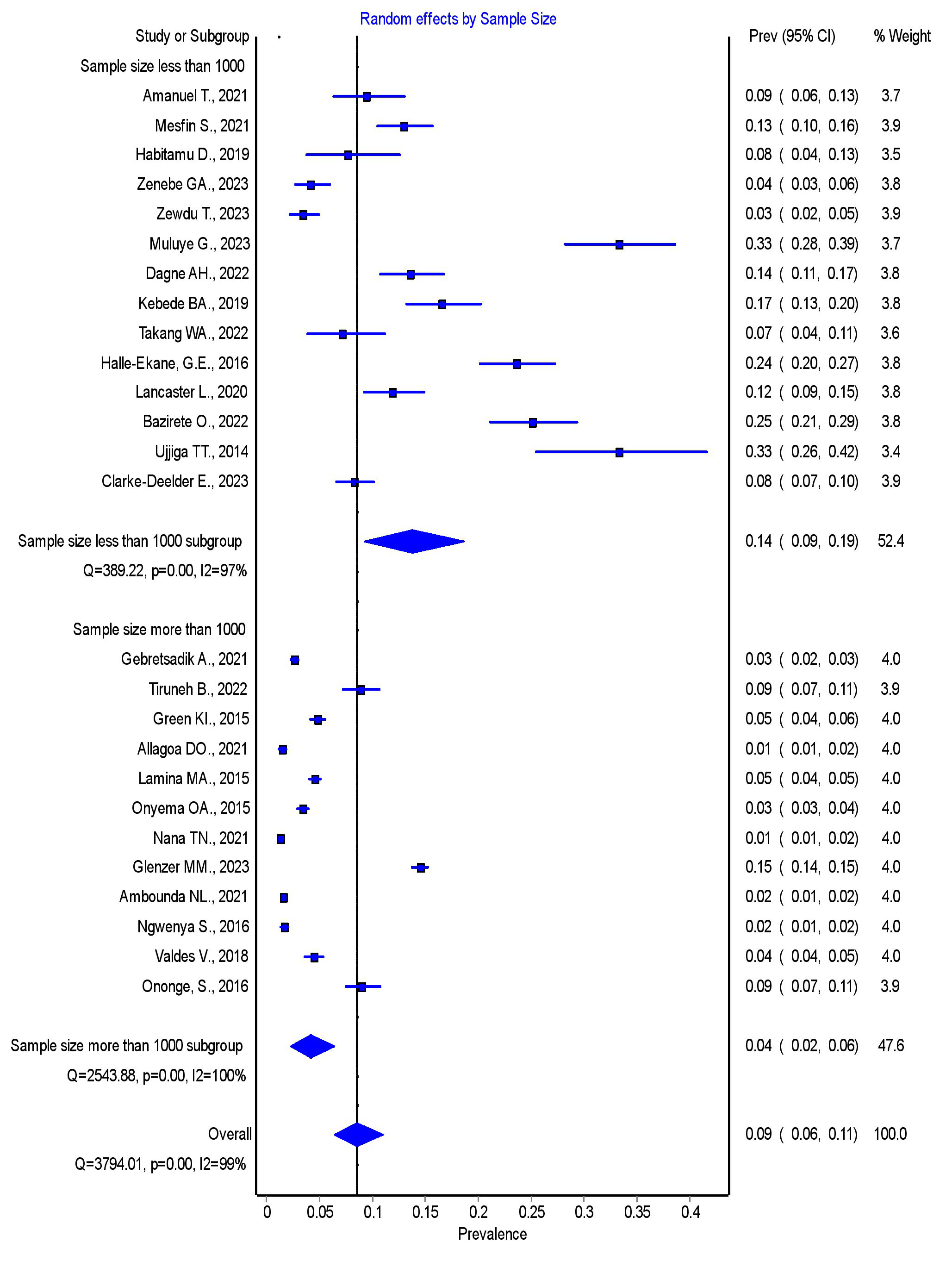 Forest plot showing the pooled prevalence of PPH in SSA by sample size. PPH, postpartum hemorrhage; SSA, sub-Saharan Africa; 95% CI, 95% confidence interval.