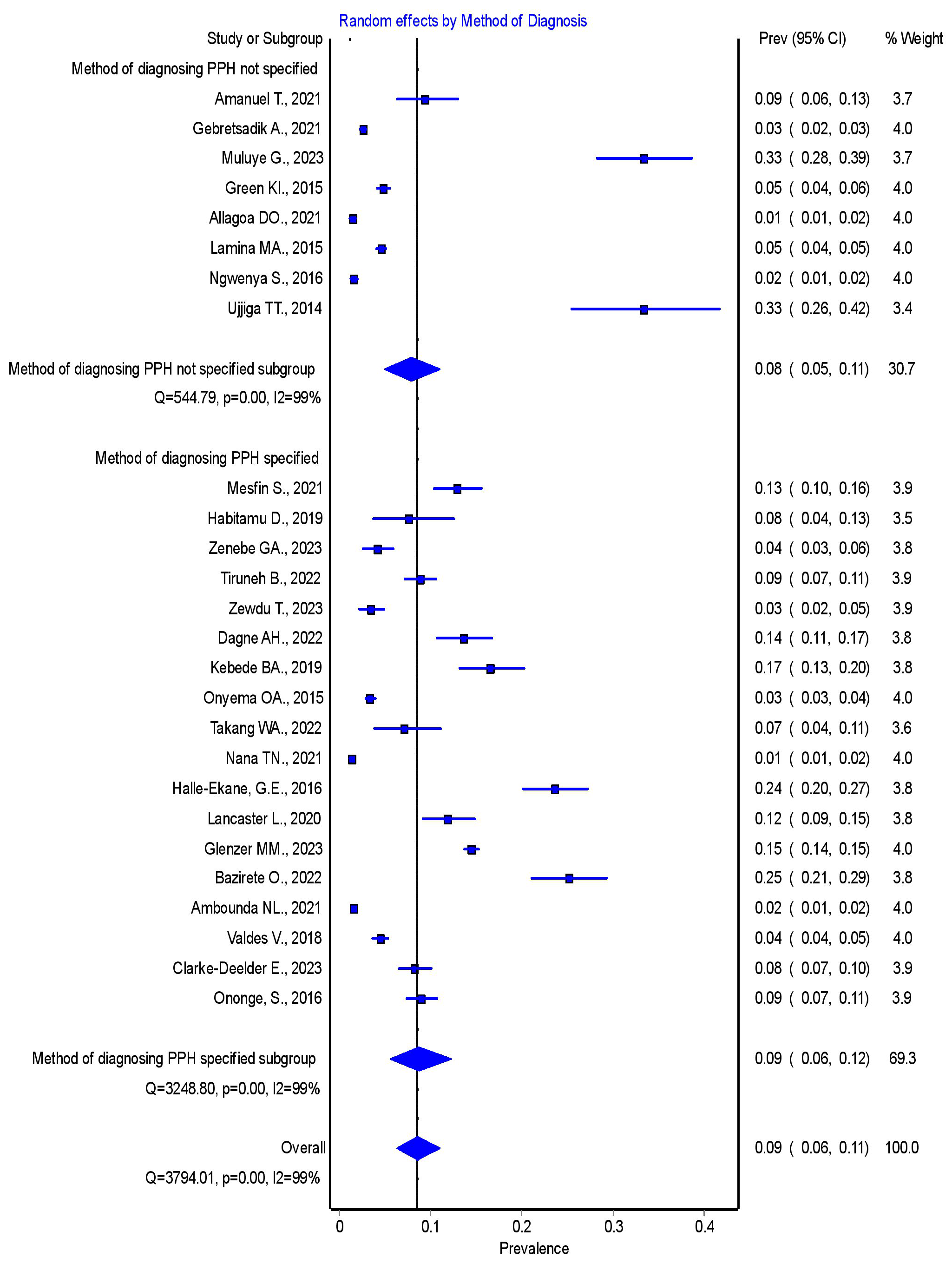 Forest plot showing the pooled prevalence of PPH in SSA by the specification of the diagnostic method used. PPH, postpartum hemorrhage; SSA, sub-Saharan Africa; 95% CI, 95% confidence interval.