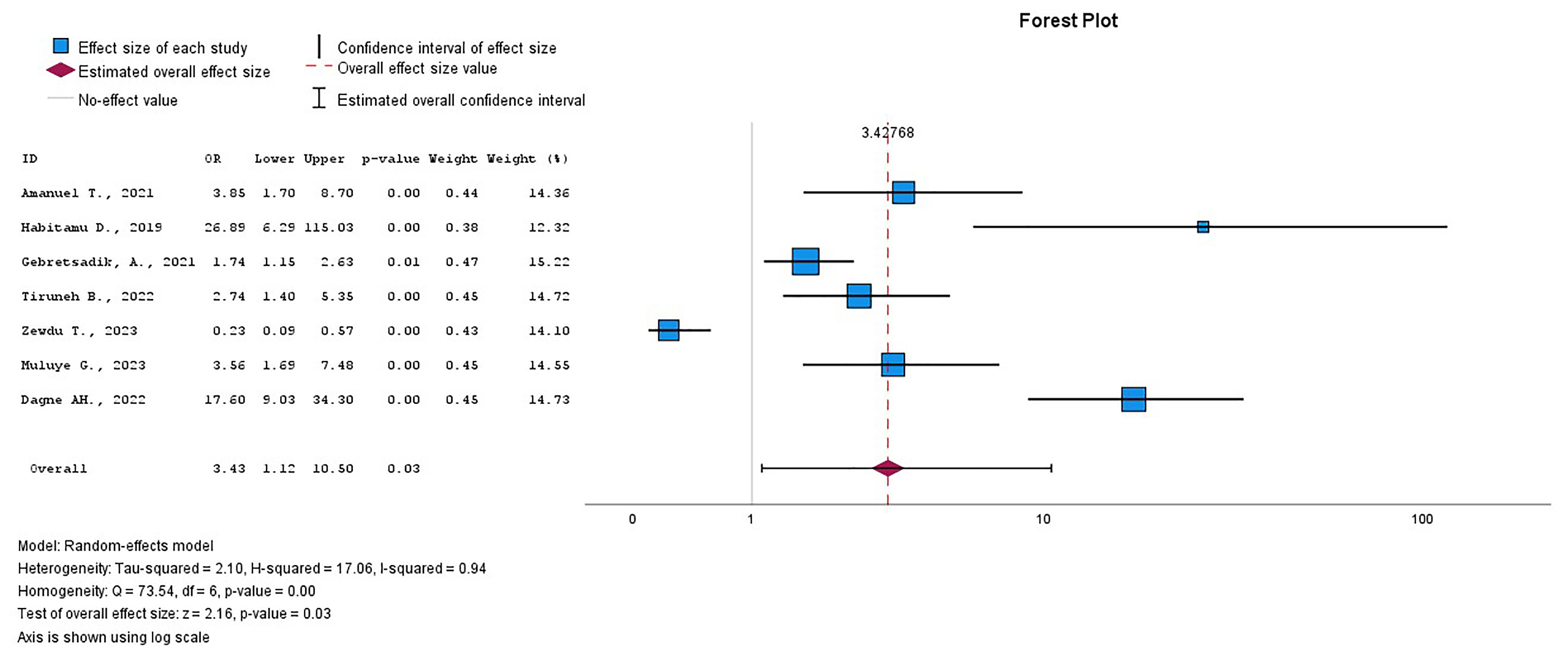 an OR of 3.43 (95% CI = 1.12–10.05), I2 = 94.1%, p