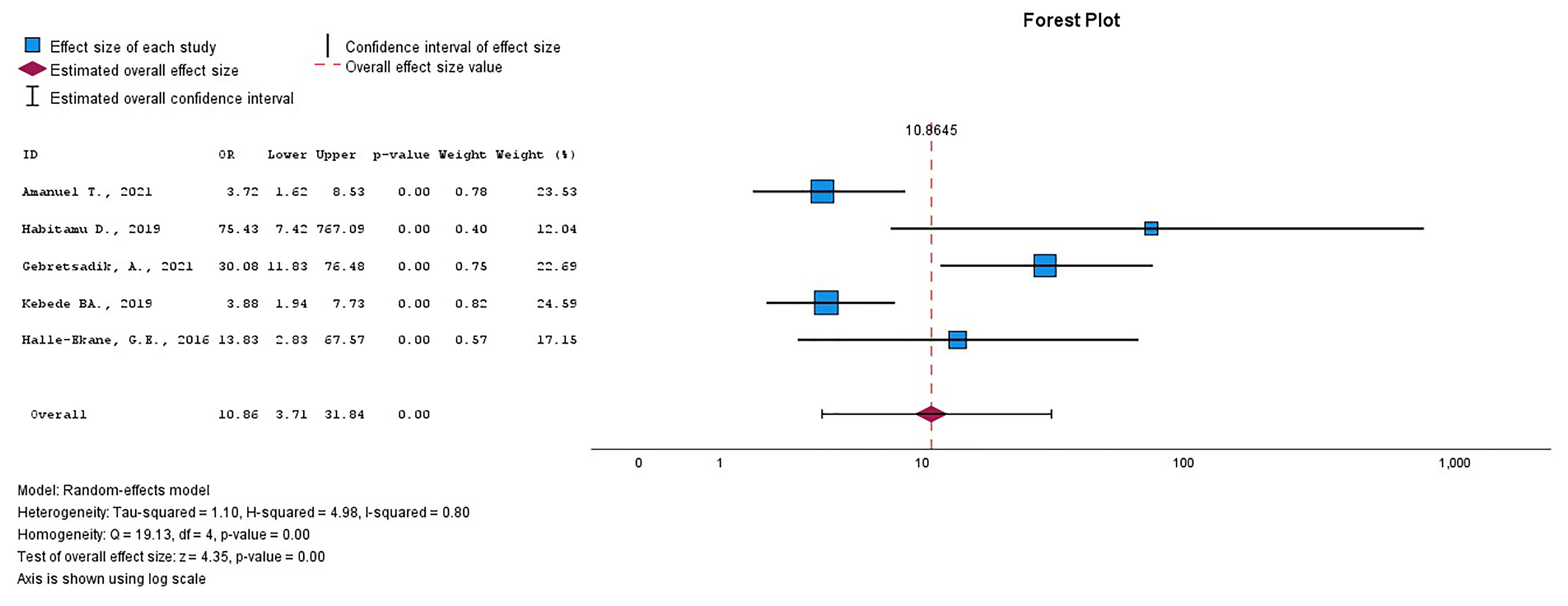 with an OR of 10.86 (95% CI = 3.71–31.84), I2 = 79.9%,