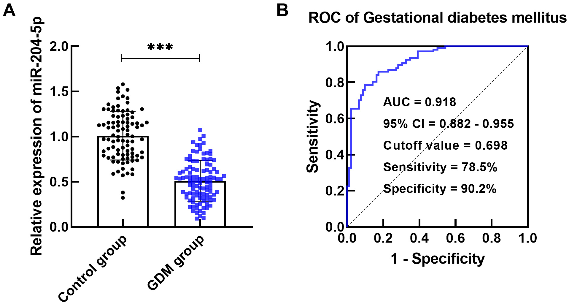 RT-qPCR assays revealed that the serum miR-204-5p level was lower in the GDM