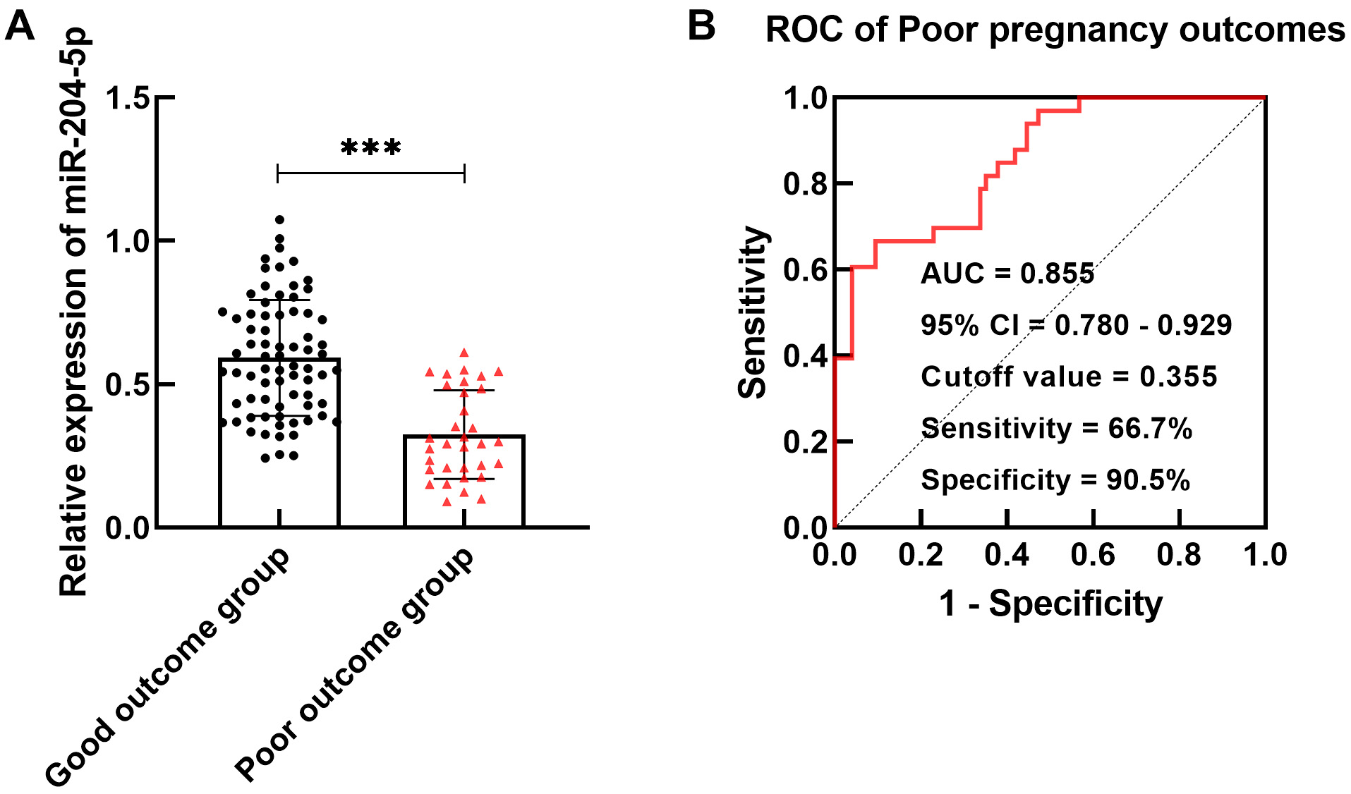 miR-204-5p expression was decreased in GDM patients compared to healthy pregnant women. The area under the curve (AUC) for distinguishing the healthy people from GDM patients was 0.918, with a sensitivity and specificity of 78.5% and 90.2%. Additionally, miR-204-5p expression in GDM patients in the poor outcome group was lower than that in the good outcome group. The AUC reflecting the potential of miR-204-5p in predicting poor maternal and infant outcomes in GDM patients was 0.855, with a sensitivity of 66.7% and a specificity of 90.5%. miR-204-5p is a risk factor for poor maternal and infant outcomes in GDM patients.