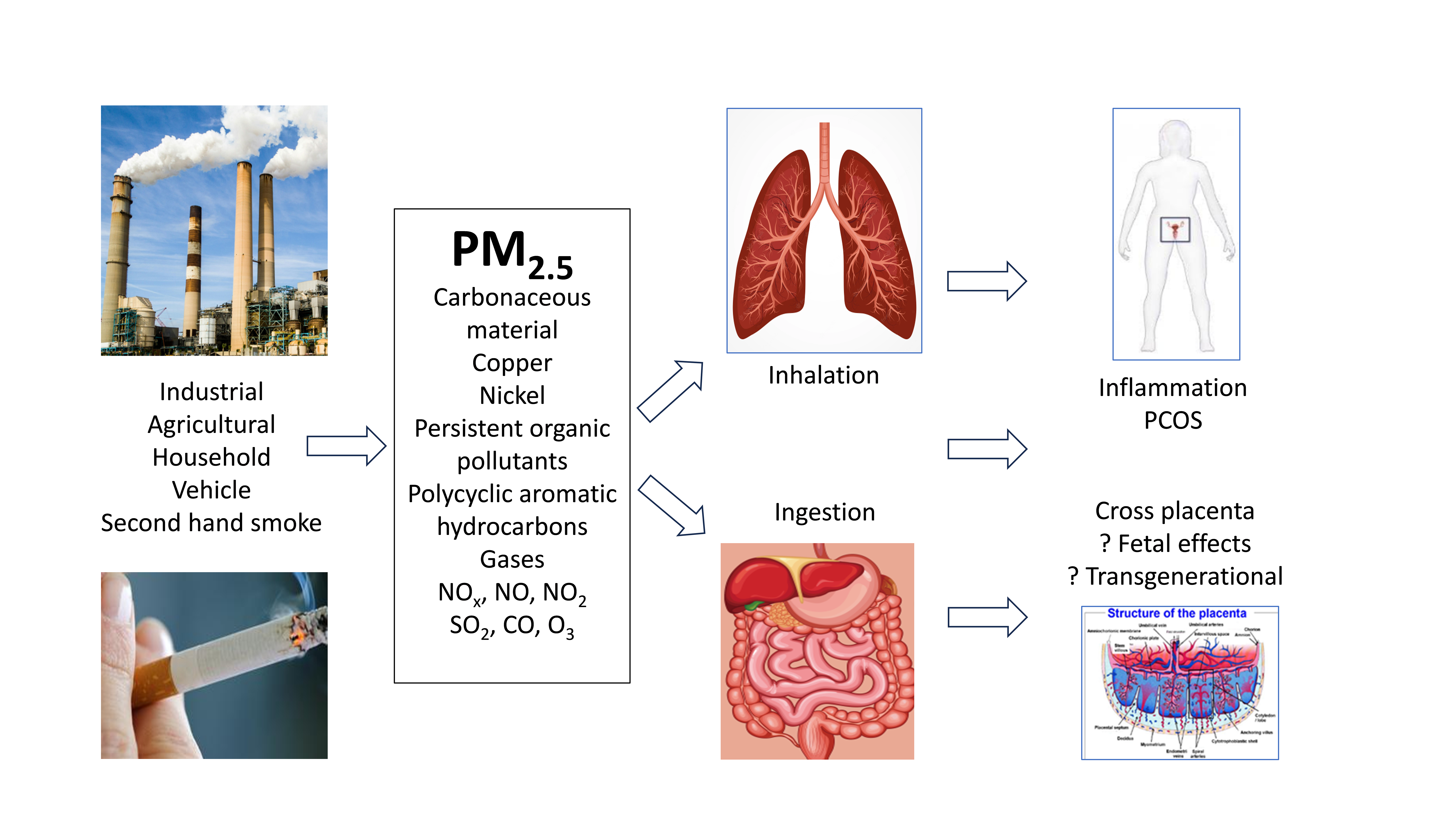 Future research on the health effects of air pollution should include cohorts of women with PCOS, who make up 10–13% of reproductive-age women. This is important because they represent a significant link to progressive chronic diseases and the future health of their offspring. Research towards decreasing exposure to pollutants and promoting smoking cessation among pregnant women and their partners should be prioritized. The potential risk of air pollution on the incidence of PCOS, as well as on fertility and pregnancy outcomes, should be highlighted in discussions aimed at mitigating the risks associated with anthropogenic induced air pollution and climate change.