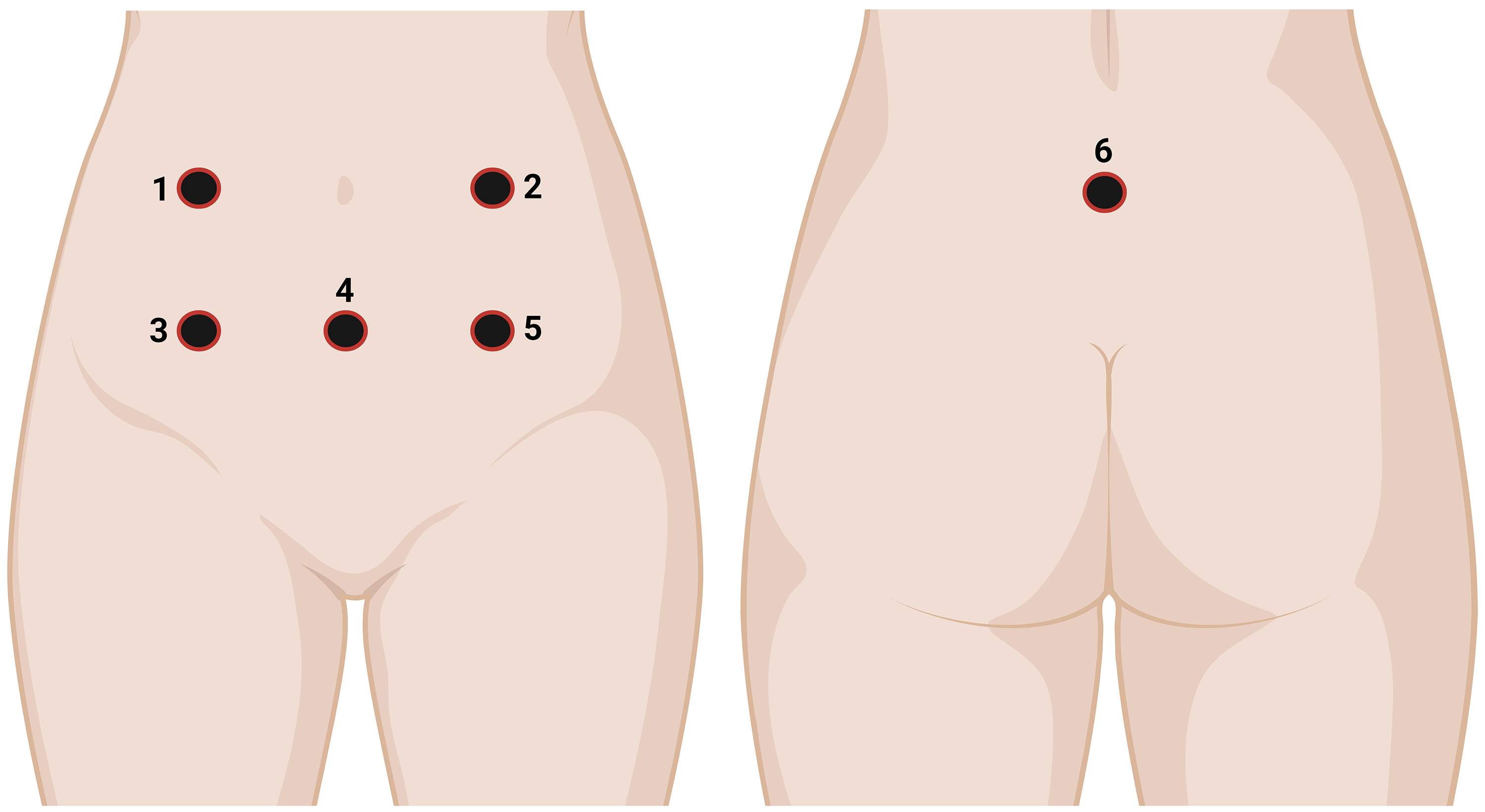 Schematic representation of the six sites used to evaluate the pressure pain threshold. Six sites were evaluated: Points 1 and 2, bilaterally 4 cm from the umbilicus; Points 3 and 5, 4 cm below the previous points; Point 4, 4 cm from the inferior border of the umbilicus; and Point 6, on the medial side of the lumbar region below the fifth lumbar vertebra (corresponding to sacral 2–4 sections).