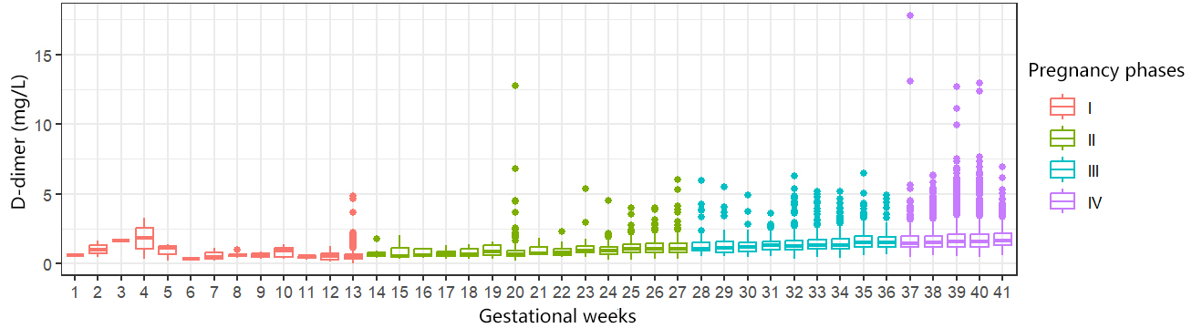 Given the existence of more than 20 types of plasma D-dimer monoclonal antibodies and the use of more than 30 detection methods in clinical practice, the lack of a uniform standard and poor comparability between various test results are significant challenges [12]. The reference intervals provided by various reagent vendors are intended for healthy nonpregnant populations, thus limiting the application of a D-dimer reference range in pregnancy; therefore, it is imperative to establish different reference intervals for different physiological stages and assays [13]. There is an urgent clinical need to determine the normal reference range for plasma D-dimer levels for each stage of pregnancy by studying the reference range of plasma D-dimer levels in healthy singleton pregnant women [14].