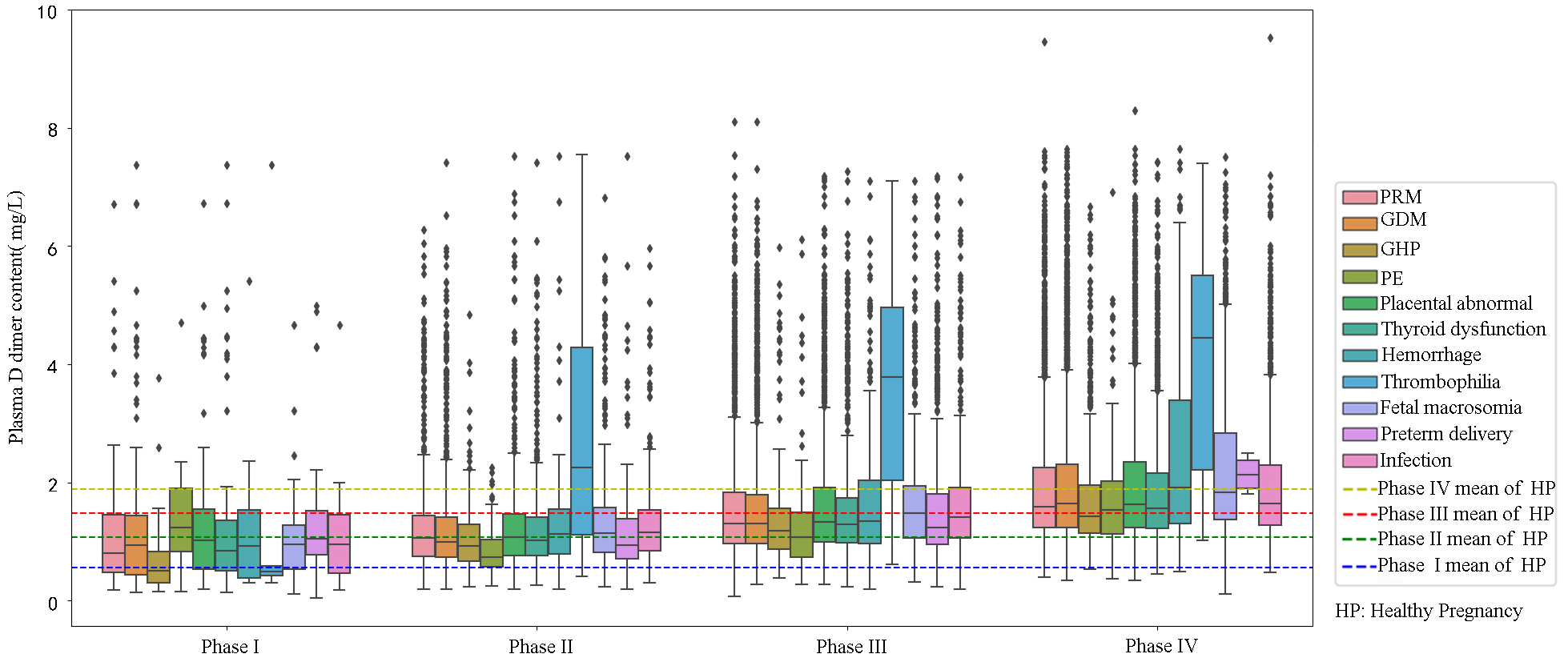 It is widely accepted that plasma D-dimer levels serve as a sensitive indicator for screening thromboembolic diseases during pregnancy and the postpartum period [15]. However, many healthcare organizations still use general population standards for D-dimer testing due to a lack of large-scale survey data on plasma D-dimer levels during pregnancy, often resulting in excessive medical treatments [16]. Therefore, this study utilized electronic medical records and laboratory test data from pregnant women in our center to establish the reference range of D-dimer levels during different stages of pregnancy through big data analysis. Additionally, it aimed to investigate the correlation between D-dimer levels and various pregnancy complications. This research provides a valuable reference for D-dimer levels in the pregnant population and offers clinicians a more comprehensive understanding of its distribution pattern, thereby facilitating the use of this marker as a guide for disease management in pregnant individuals.