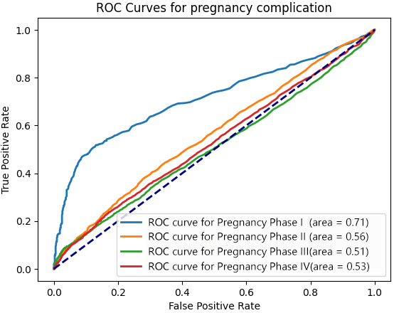 The clinical data of 19,117 women who delivered at Wenzhou People’s Hospital between January 1, 2020, and September 30, 2022, were retrospectively analyzed. A total of 74,401 D-dimer test results were extracted from the laboratory information system. Following data screening and matching, 7692 records of D-dimer test results for healthy pregnant women and 19,005 records for pregnant women with complications were selected. D-dimer reference values were calculated for early pregnancy (1–13 weeks gestation), mid-pregnancy (14–27 weeks gestation), late pregnancy (28–36 weeks gestation), and the end of pregnancy (37–41 weeks gestation). A logistic regression model was used to plot receiver operating characteristic (ROC) and determine cut-off values for predicting pregnancy complications in each phase.