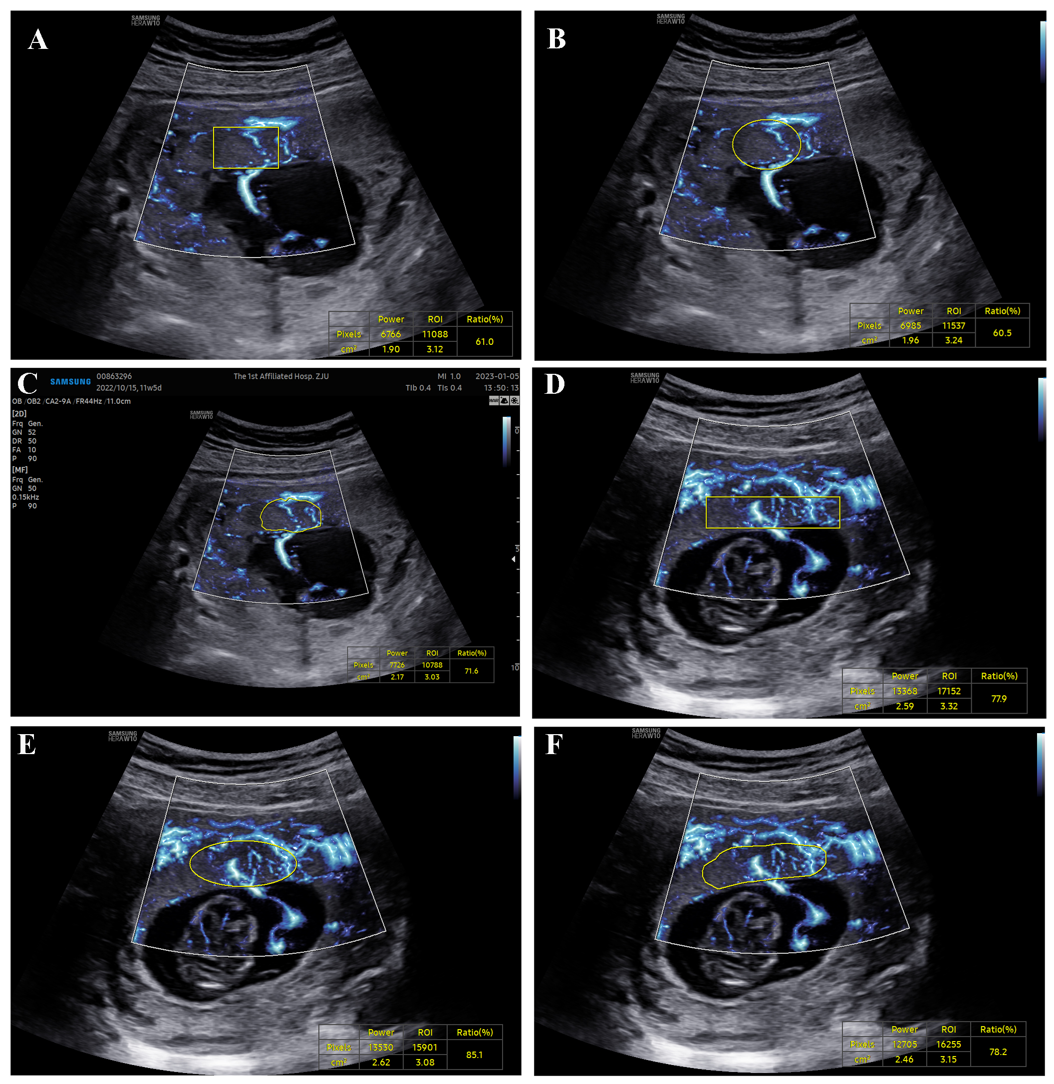 There were no statistically significant differences between the infection group and the normal group in terms of age, gestational age, parity, gestational number, placental position, placental thickness, and other factors (p > 0.05). The VIMV values obtained by elliptical, rectangular, and manual tracing methods at the same placental level in the MV-Flow mode showed no statistically significant differences (p > 0.05). Except for PI of right UtA, The VIMV values and the S/D, PI, and RI of UtA were not significantly different between the infection group and the normal group (p > 0.05). Within the infection group, no significant differences were observed in VIMV value, placental thickness, S/D ratio, PI, RI of UtA, or neonatal weight between the adverse pregnancy outcome good pregnancy outcome group (p > 0.05).