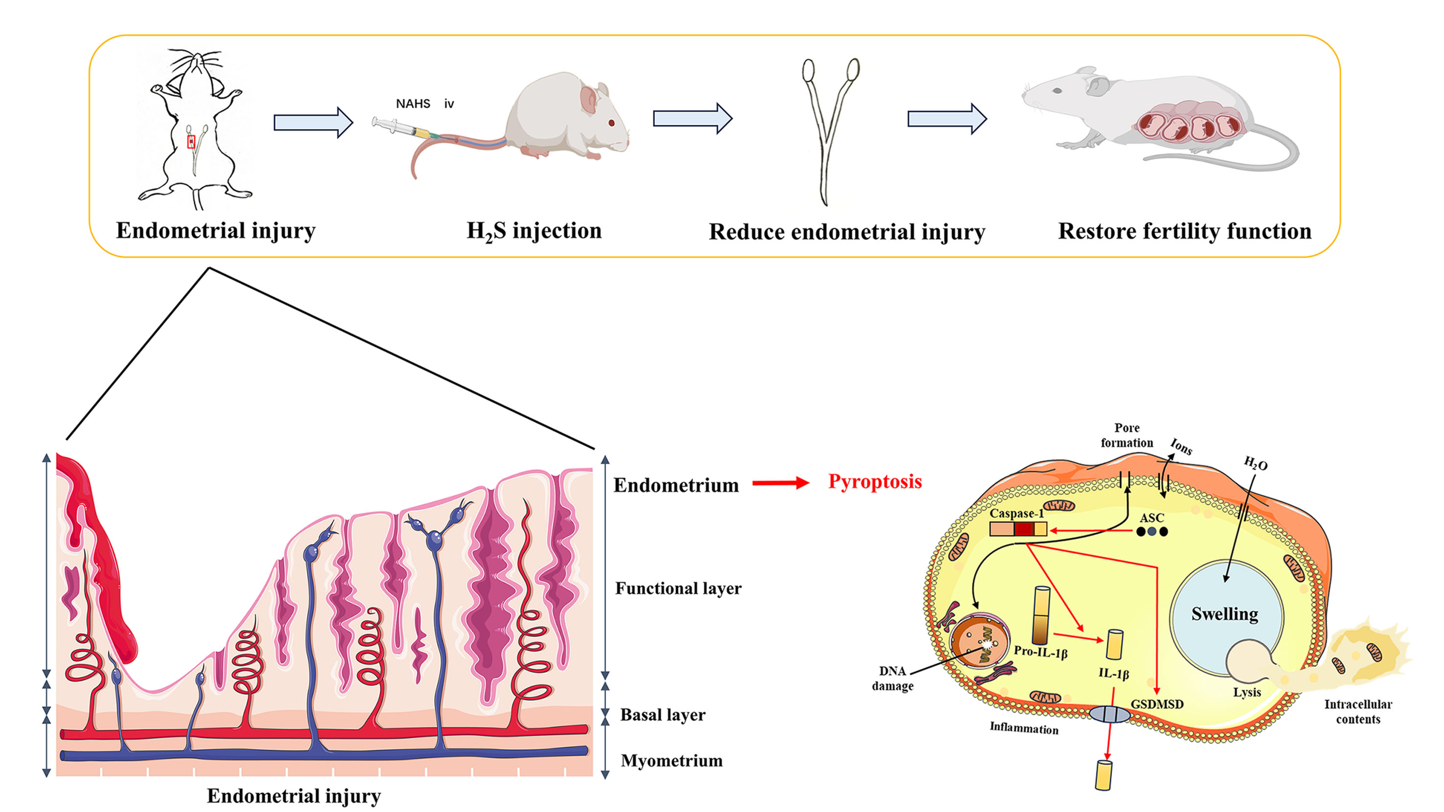 In conclusion, our study demonstrated that endogenous H2S metabolism and pyroptosis is involved in the pathological process of endometrial injury. This dual action of reducing inflammation and fibrosis while modulating pyroptosis pathways highlights the therapeutic potential of exogenous H₂S in enhancing fertility and treating uterine disorders.