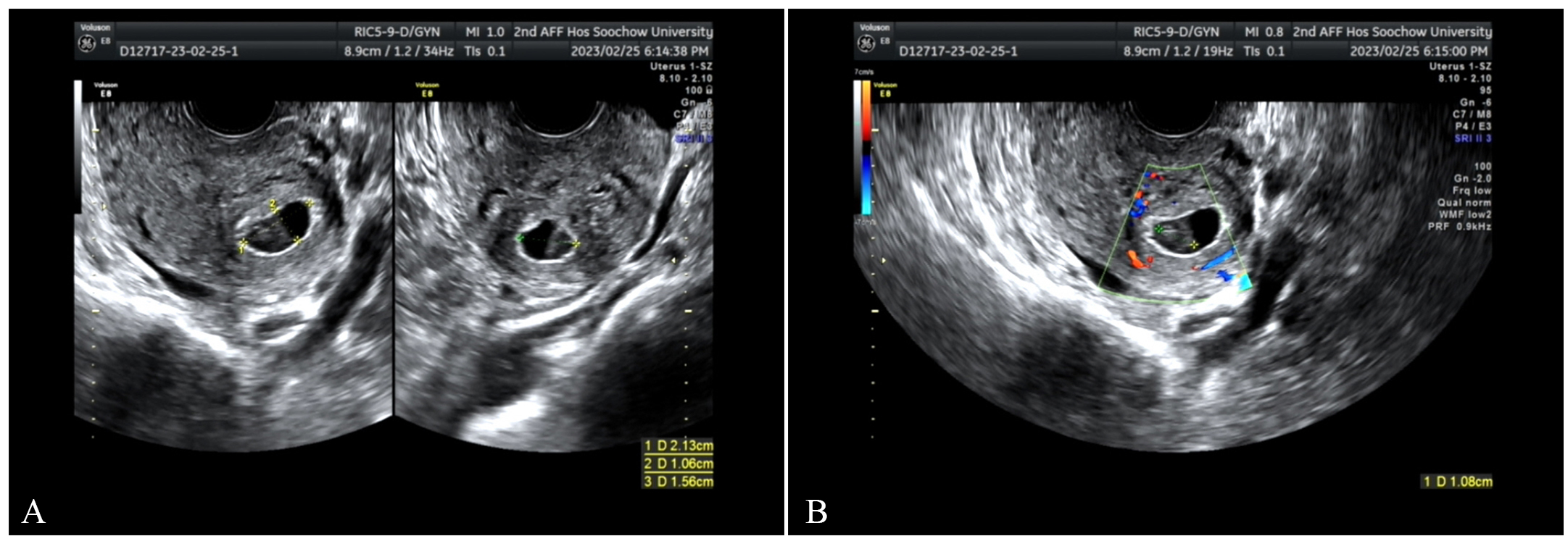 Fig. 1. On February 26, transvaginal ultrasound scan. (A) A gestational sac was seen near the uterine angle, measuring approximately 21 mm