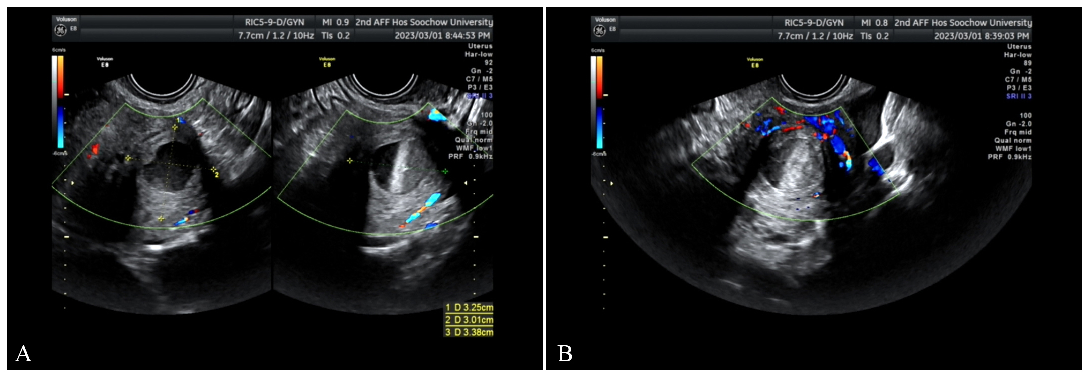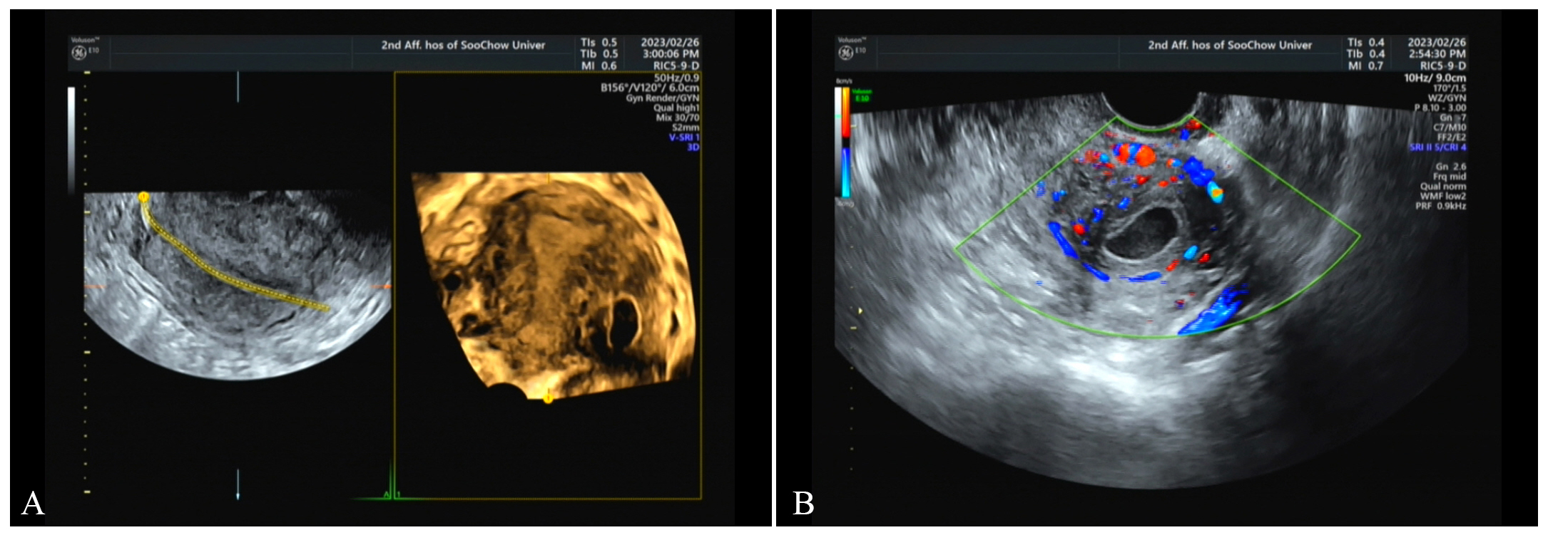 Fig. 2. On February 28, transvaginal three-dimensional ultrasound (TDU). (A) There was an echo of the gestational sac between the muscle walls. (B) Blood flow signals around it are increased.